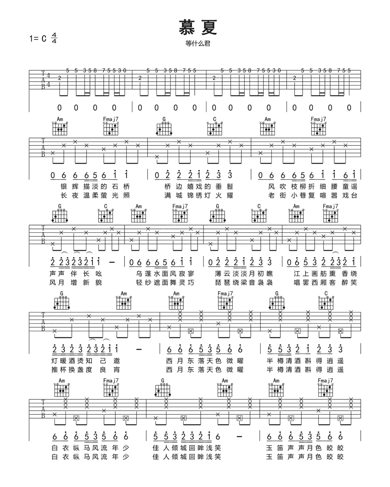 曲谱介绍: 《慕夏》是一首由等什么君演唱的古风歌曲,一样的是都是古风,但不同于之前风格的歌曲,不一样的曲风,这是一首适合夏天的轻快小调歌曲,这首歌大概的意思是:夏天的夜晚灯火阑珊,大街小巷都各自喧哗。古镇中一位白衣少年在月光下玉笛声声,一位佳人在月影下起舞翩翩。两人在月老树下共求姻缘,希望彼此能够执子之手,与子偕老。
