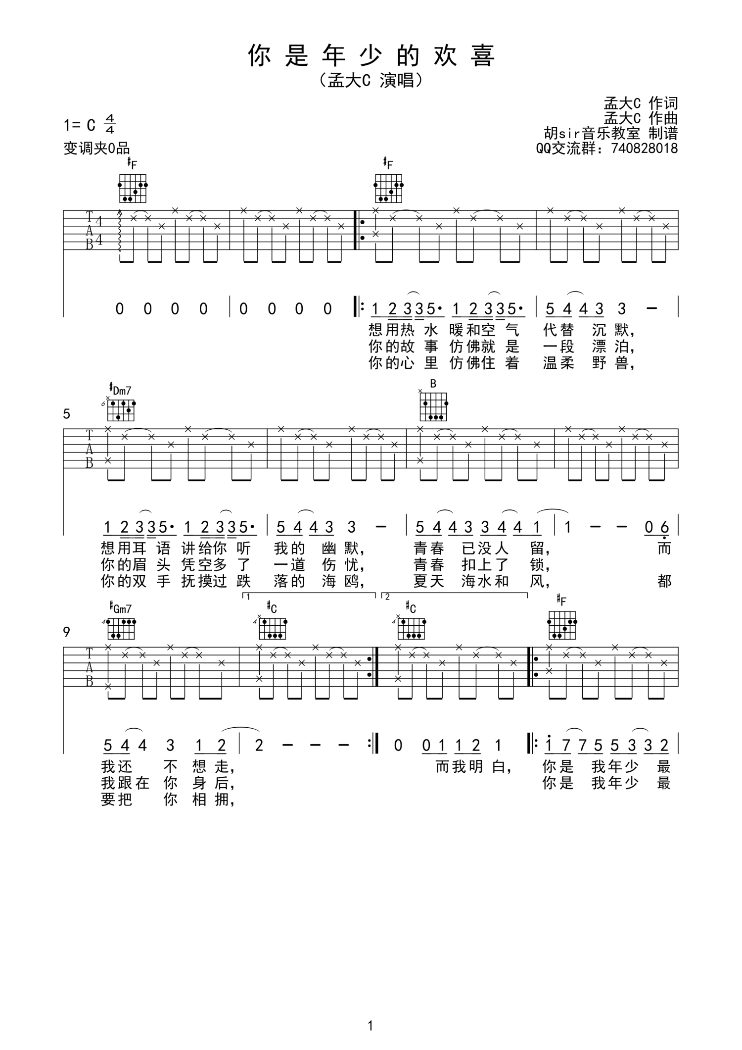 • 你是年少的欢喜吉他谱 - 孟大C/王贰浪 - 吉他弹唱谱第1张