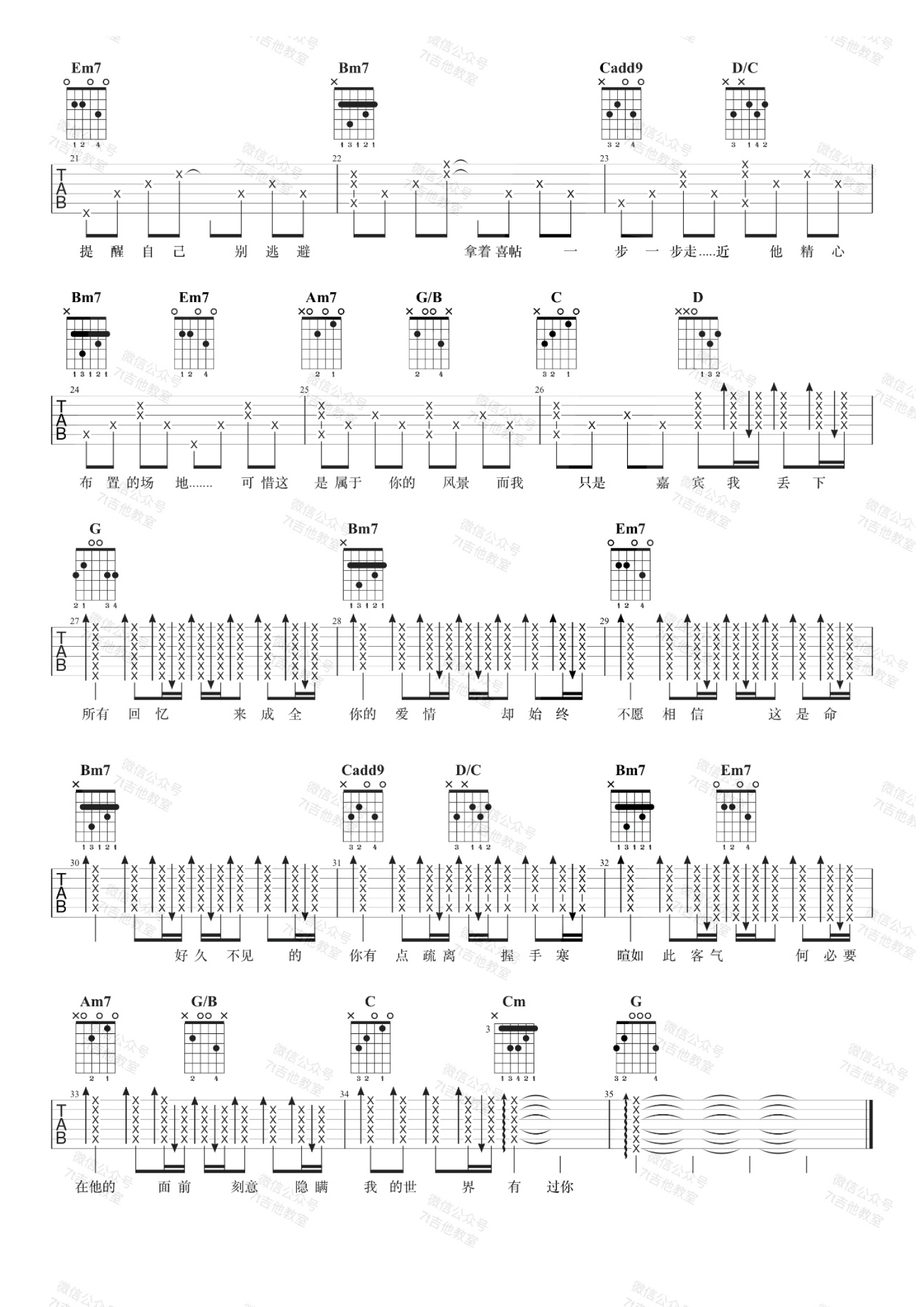曲谱介绍: 嘉宾吉他谱,张远演唱,原调是A大调,用的是G大调的指法来编配,演示视频里老师用了降半音调弦。如果想弹原调,用标准音调弦并且变调夹夹在第2品就可以。和弦分析:首先讲一下比较基本的,把三和弦丰富一下,二级、三级、六级用了小七;四级用了add9;五级用了sus4以及4/5……「原来早已有人为你订做……」这一句,可以看作是一个升级版的二级到五级,其中在二级后面加了二级的大三和弦转位A/C#,A可以看作是副属和弦(后面五级D的属和弦),低音用C#来代替,起到了低音上行的效果。「是属于你的风景,而我……」这句Am7→G/B→C用了斜杠和弦的常见用法,二级和四级中间加入1/3。结尾的C→Cm→G是四级小和弦的常见用法,通常在终止式里可以见到。