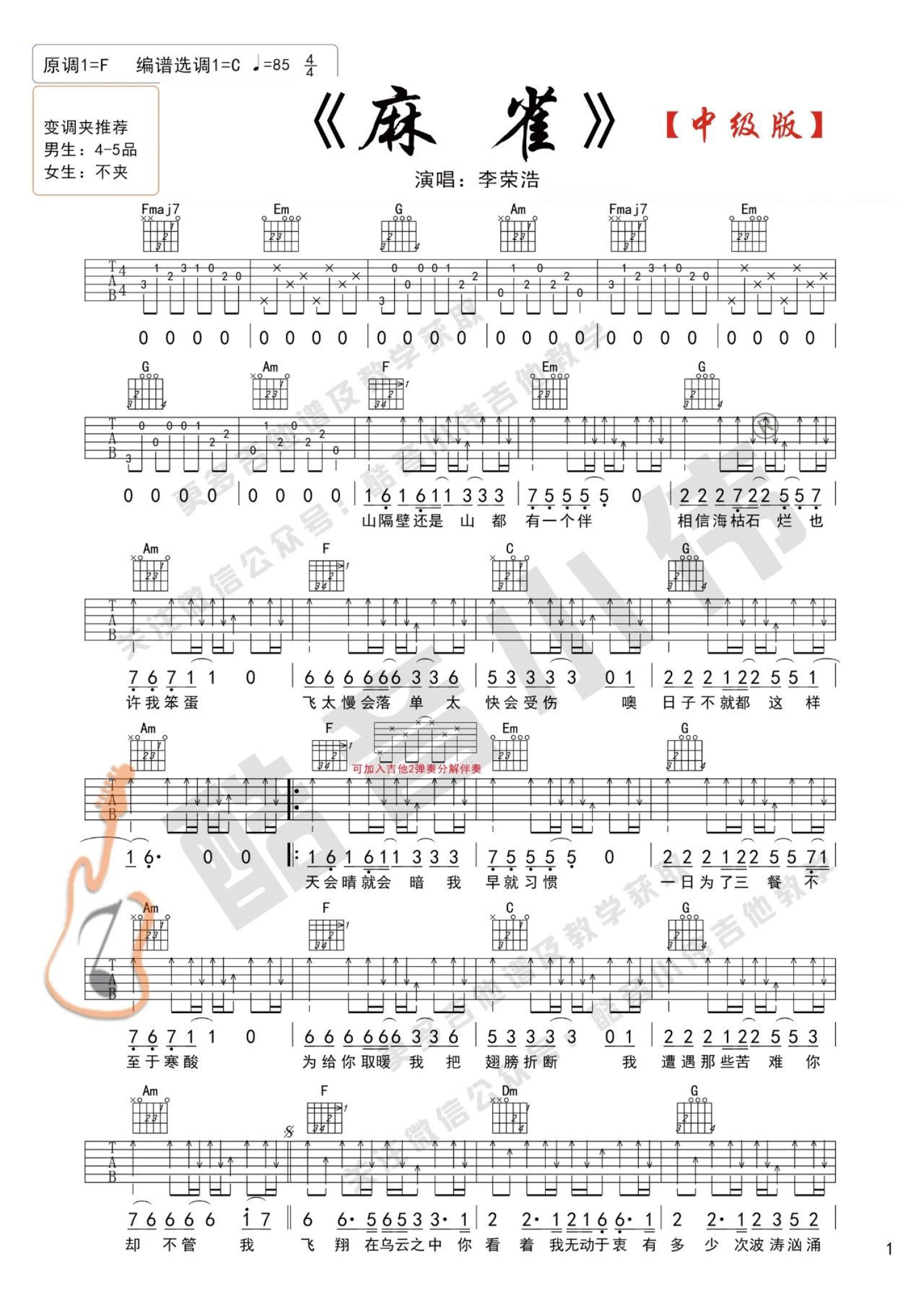 曲谱介绍: 李荣浩《麻雀》,几分钟的歌曲却唱出了多少在外打拼的人的心声。麻雀虽小五脏俱全,也这首歌要表达的意思不谋而合,就算是再渺小的如蝼蚁一般的人,也是有血有肉有灵魂的。昂扬的旋律和励志的情怀告诫我们,虽然和麻雀一样渺小的生活,却也有着大大的梦想。《麻雀》吉他弹唱视频教学讲解分享来自酷音小伟编配的《麻雀》吉他谱,演奏时候有些扫弦伴奏也可以替换为分解伴奏,谱子上又标注说明。