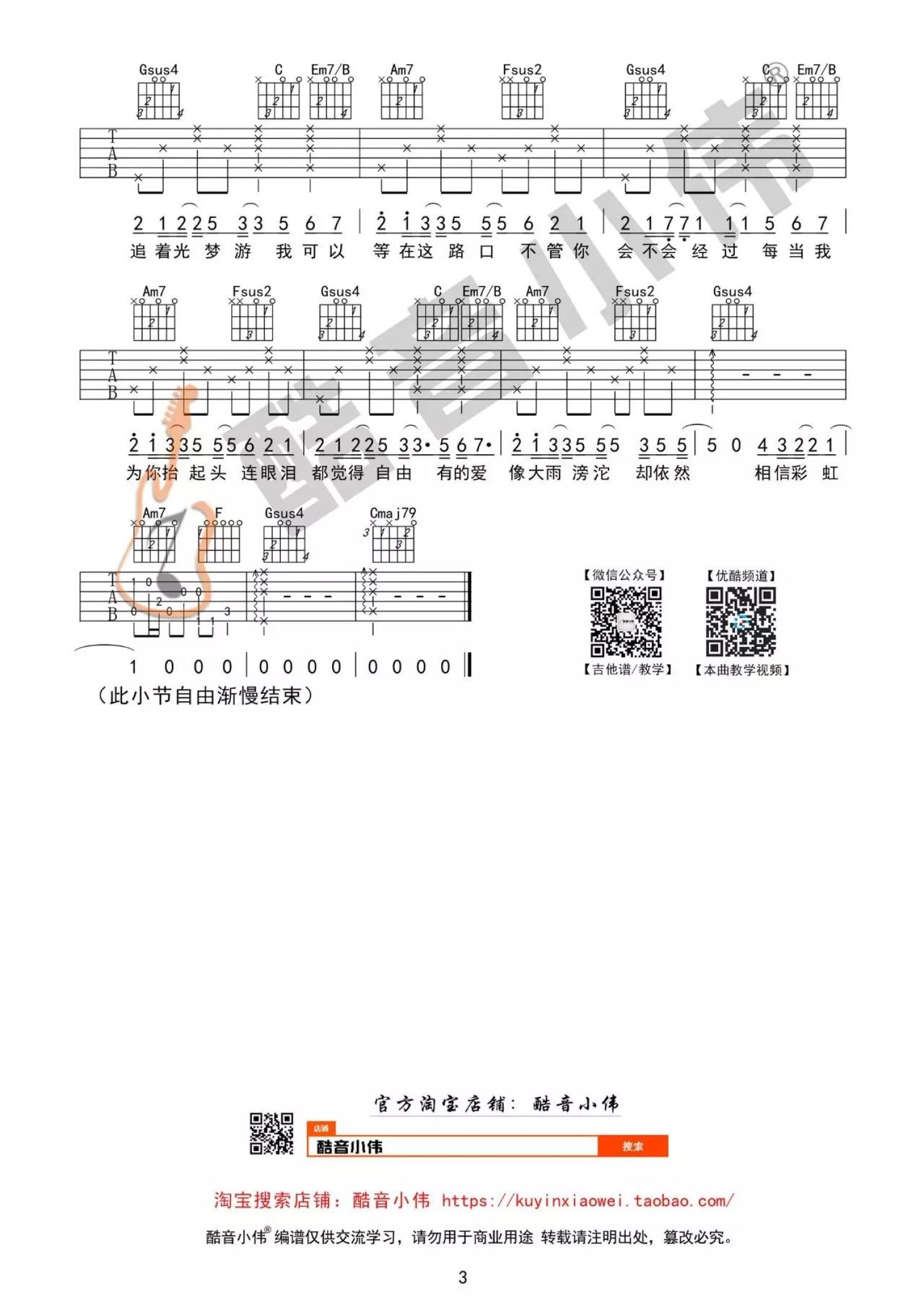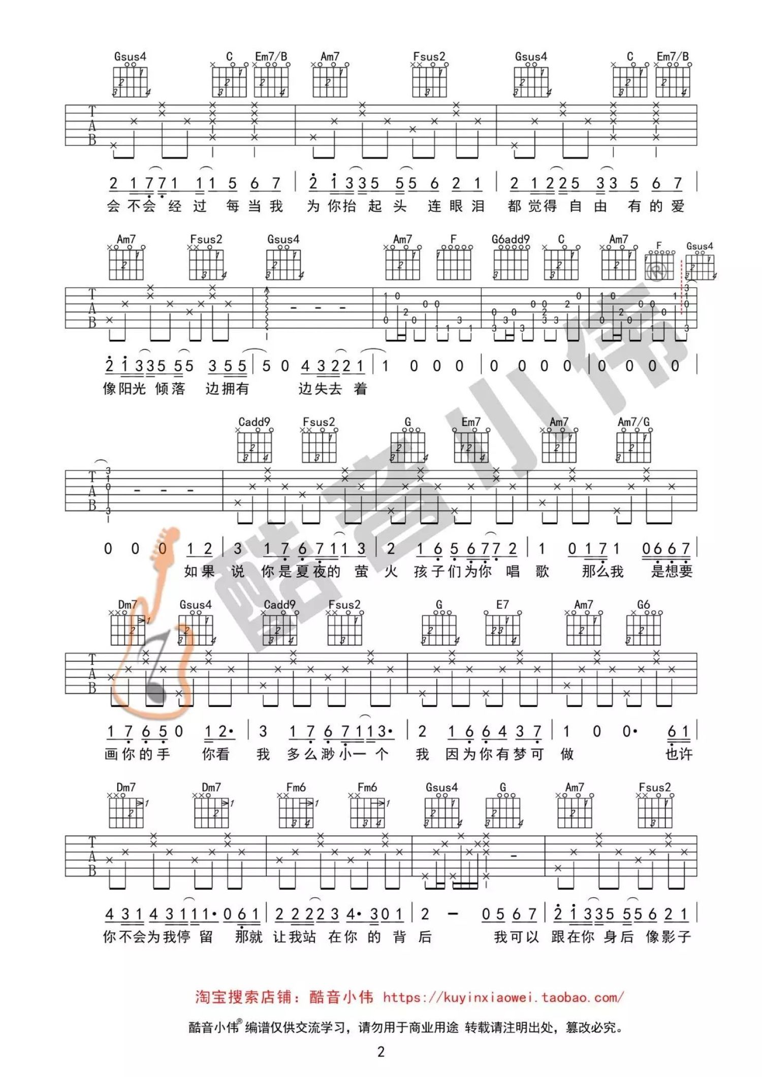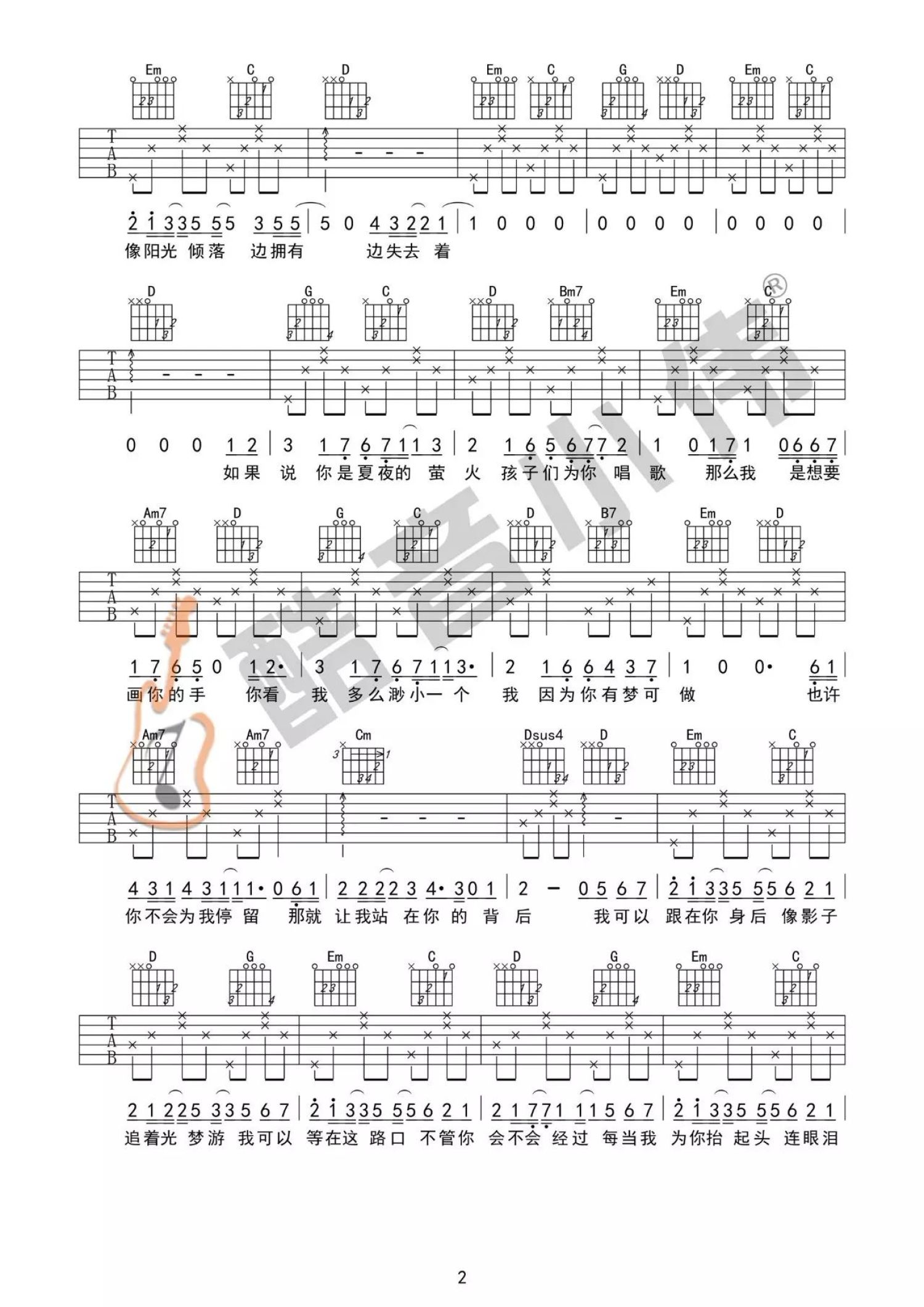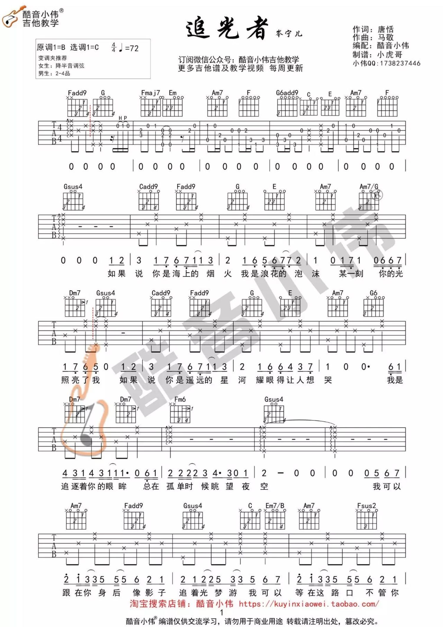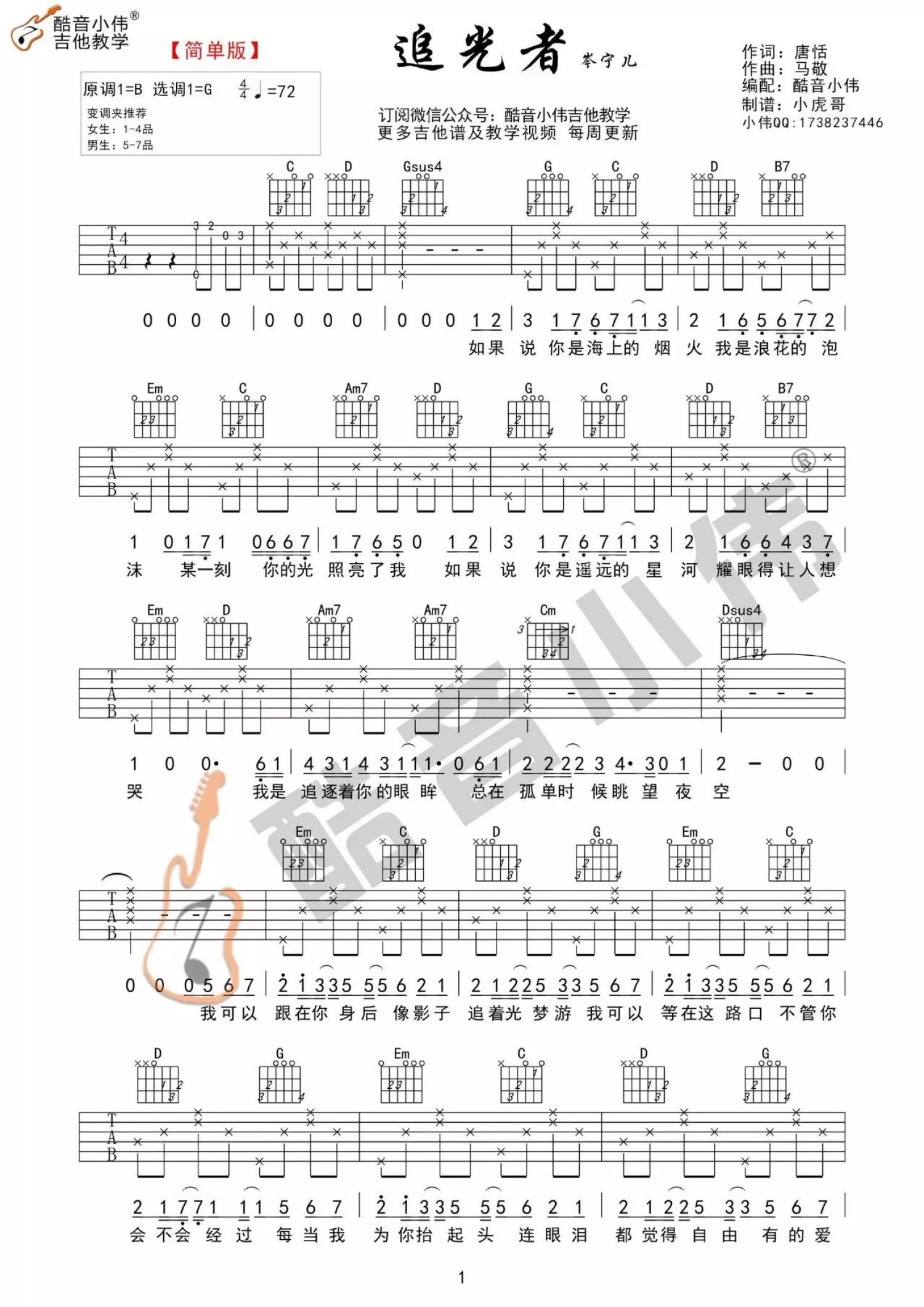 曲谱介绍: 岑宁儿《追光者》,温柔舒缓的声线诉说着一段难言的爱恋。我可以跟在你身后,像影子追着光梦游,我可以等在这路口,不管你会不会经过。单纯而坚定的爱意,却不卑微,因为你的存在而让自己变得更好。如果你是那一束光,那我甘愿成为追光者,哪怕距离像是海上的烟火和浪花的泡沫,或如遥远的星河,而我仅是追逐着你的眼眸。但是只要你的光芒照亮着我,我便像影子追随,希望每个追逐光的你,最后都可以拥抱那一束光。《追光者》吉他弹唱视频教学来自酷音小伟编配《追光者》吉他谱,原调B调,视频里采用C调指法编配,男生弹唱变调夹夹2-4品,女生不夹或夹负一品。前奏部分较难,大家可以在视频里听老师的详解。
