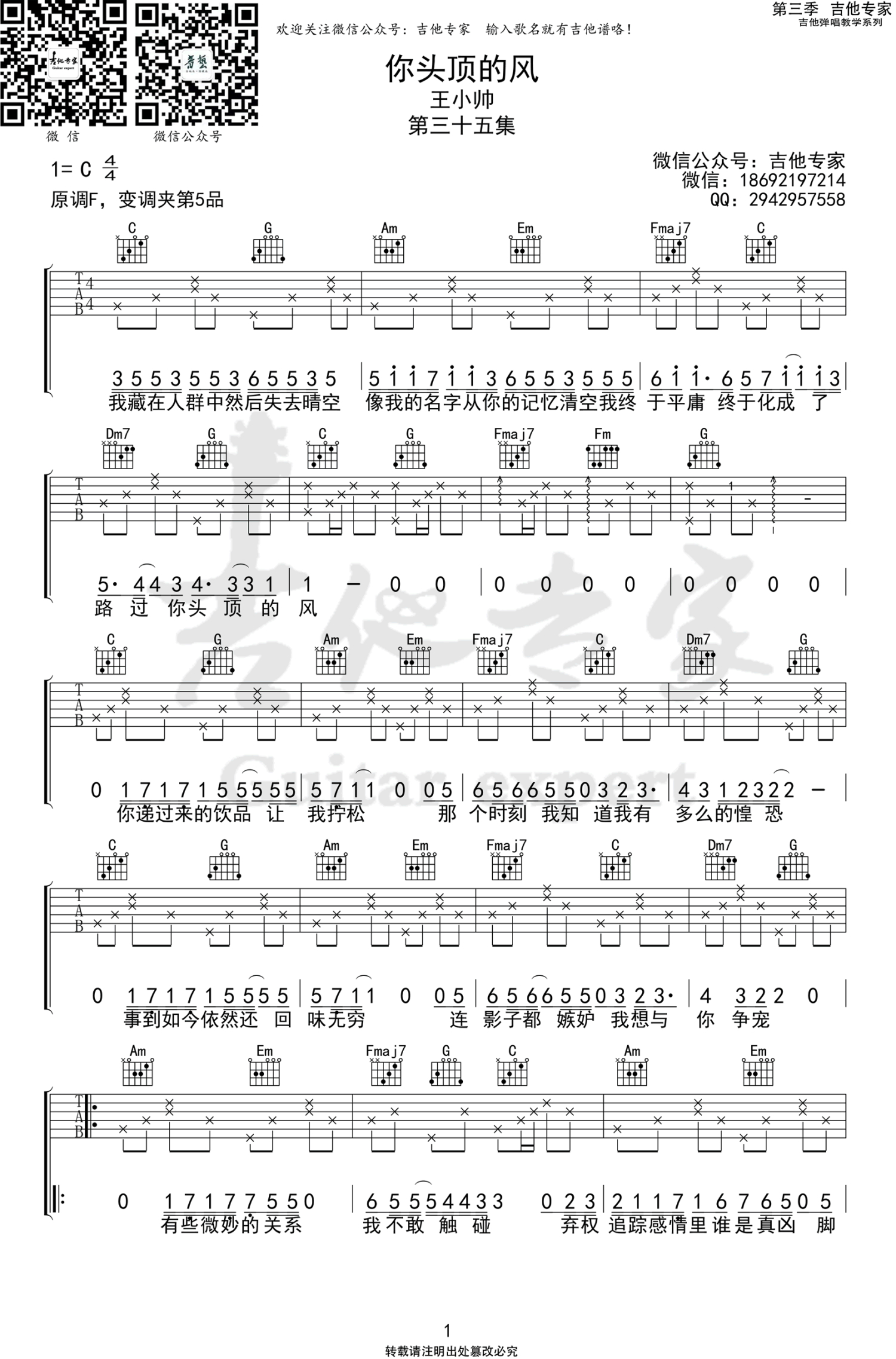 你头顶的风吉他谱 - 王小帅 - C调吉他弹唱谱