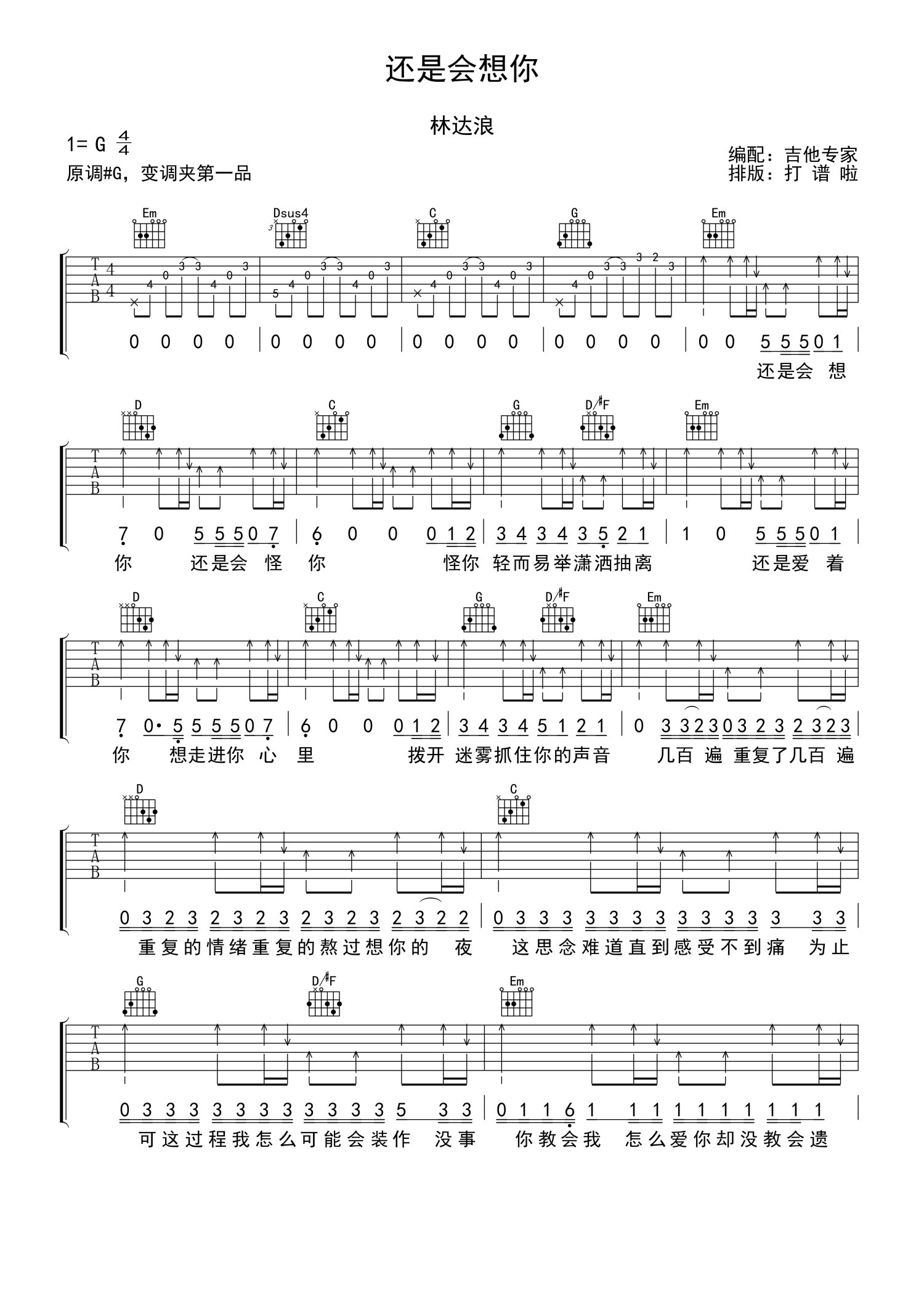 曲谱介绍: 林达浪《还是会想你》吉他谱_G调吉他弹唱谱