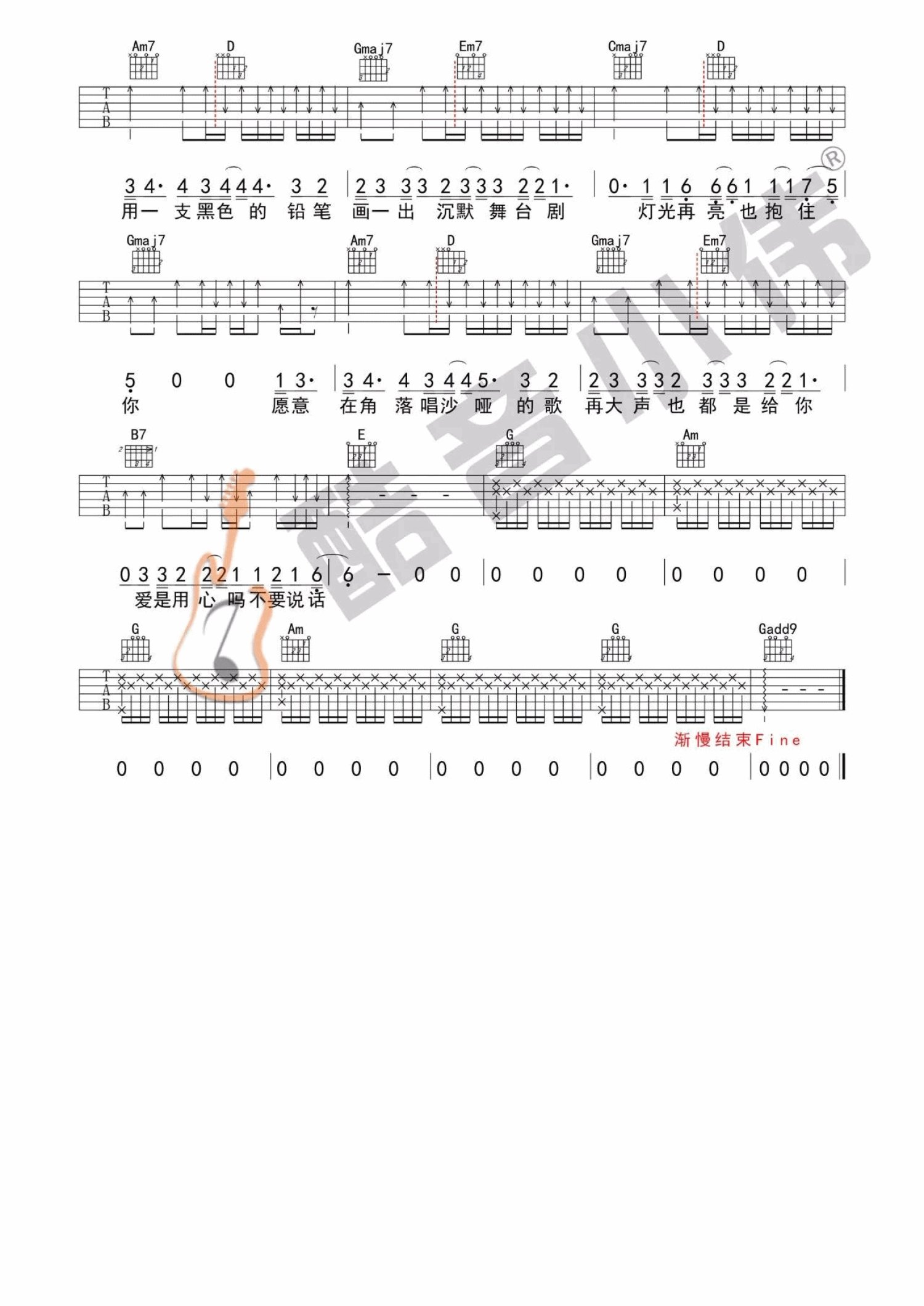 曲谱介绍: 陈奕迅《不要说话》吉他谱_G调吉他弹唱谱_中级版