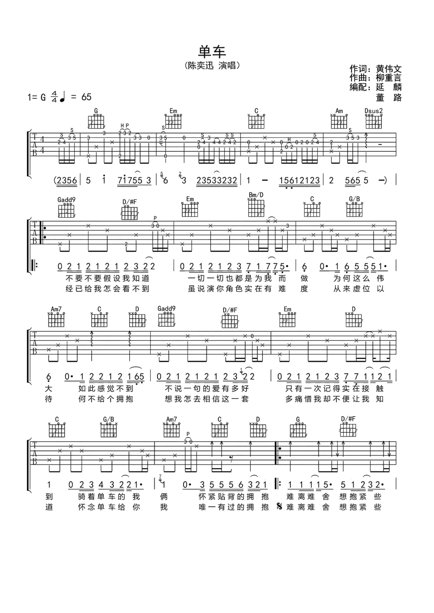 曲谱介绍: 陈奕迅《单车》吉他谱_G调吉他弹唱谱