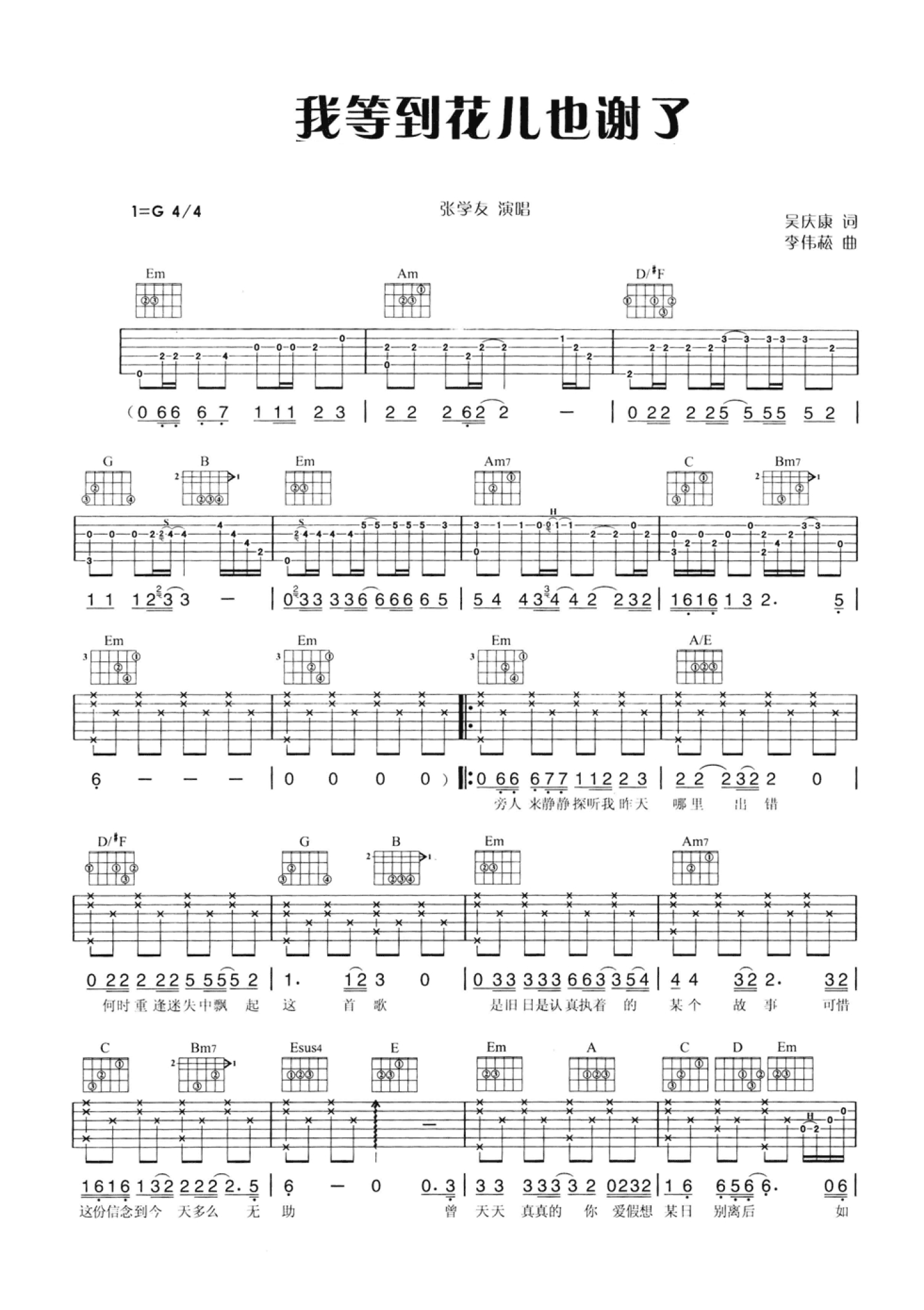 曲谱介绍: 张学友《我等到花儿都谢了》吉他谱_G调吉他弹唱谱