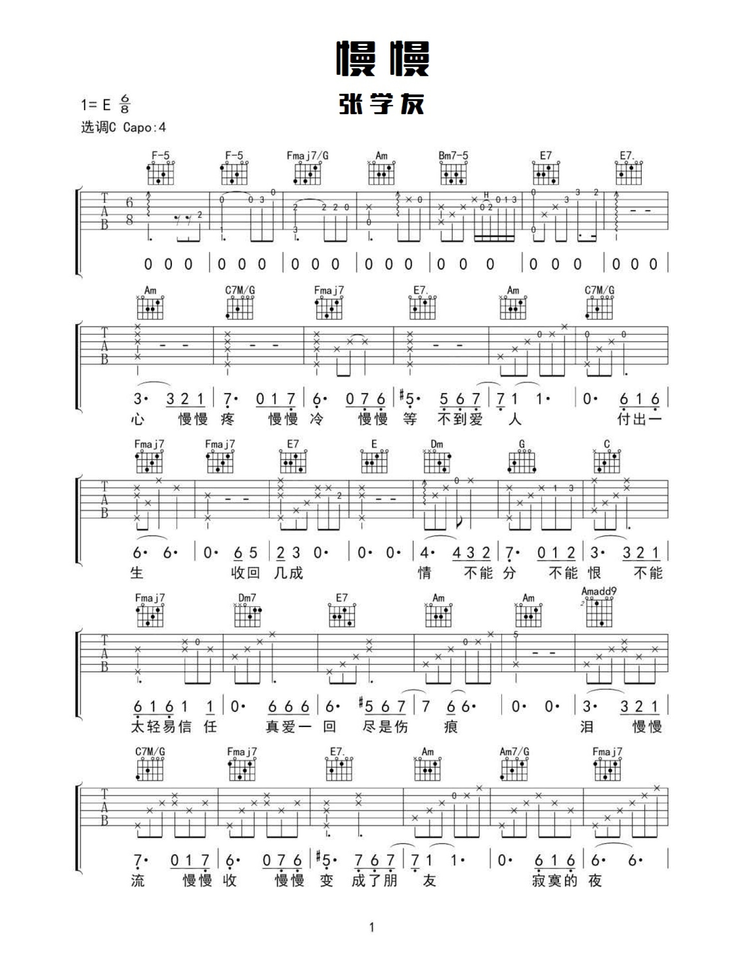 曲谱介绍: 张学友《慢慢》吉他谱_C调吉他弹唱谱