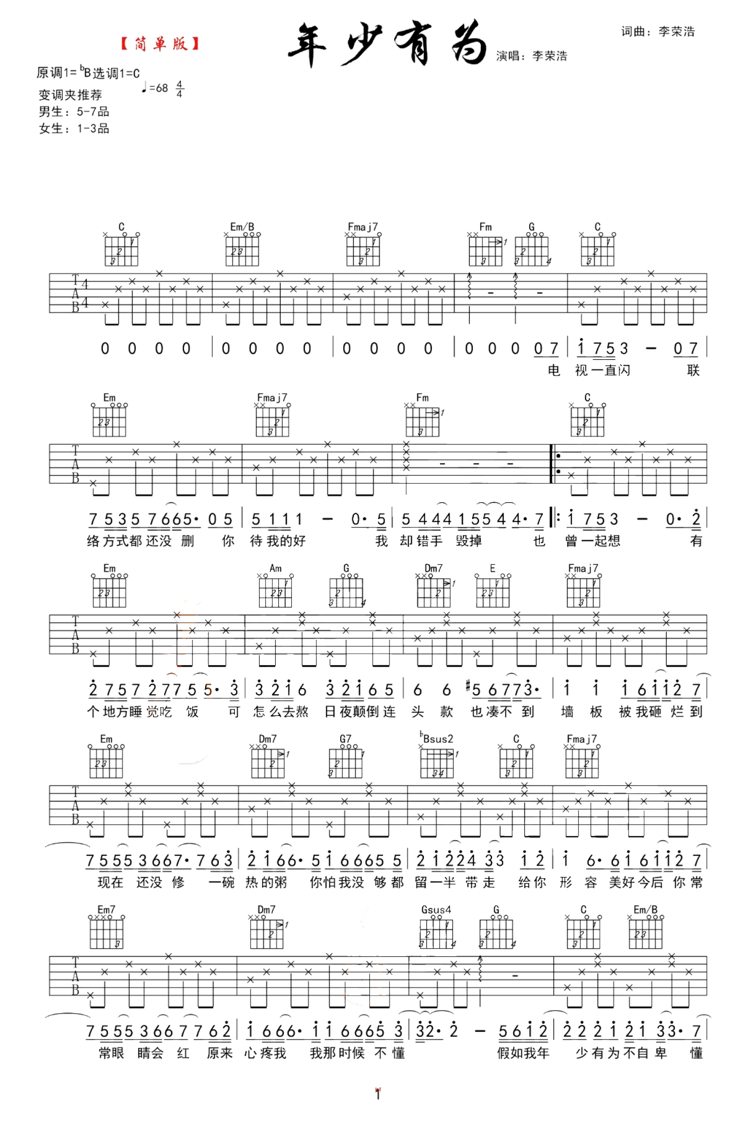 年少有为吉他谱 - 李荣浩 - C调吉他弹唱谱 - 简单版