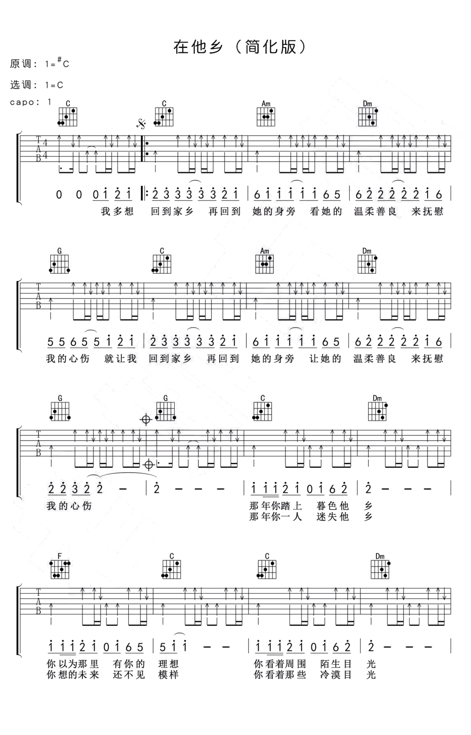 在他乡吉他谱 - 水木年华 - C调吉他弹唱谱