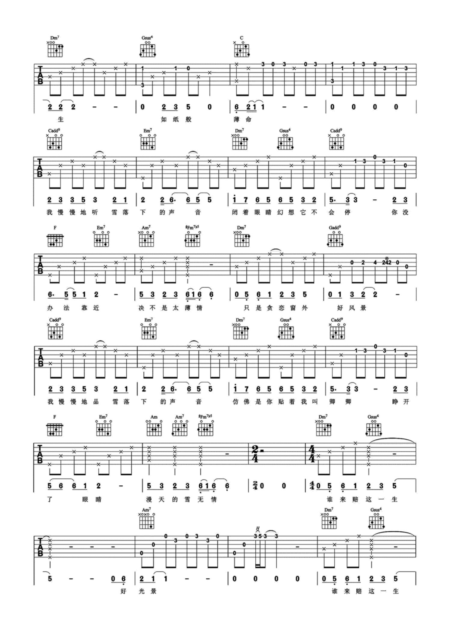 曲谱介绍: 雪落下的声音吉他谱,陆虎演唱,电视剧《延禧攻略》片尾曲,随谱附上老师带来吉他弹唱教学视频,为方便弹唱,曲谱改编自秦岚演唱的女生版,选用C调指法编配,仅前奏和尾奏有点小难,不过相信琴友们多多练习会突破。曲调悠扬轻柔,歌声婉转呢喃,诉一腔愁肠,叹相思难遇,相逢难守,若无你在,何来好光景?吉他弹唱演示及视频教学