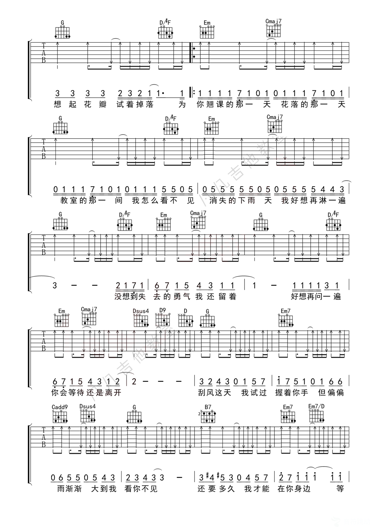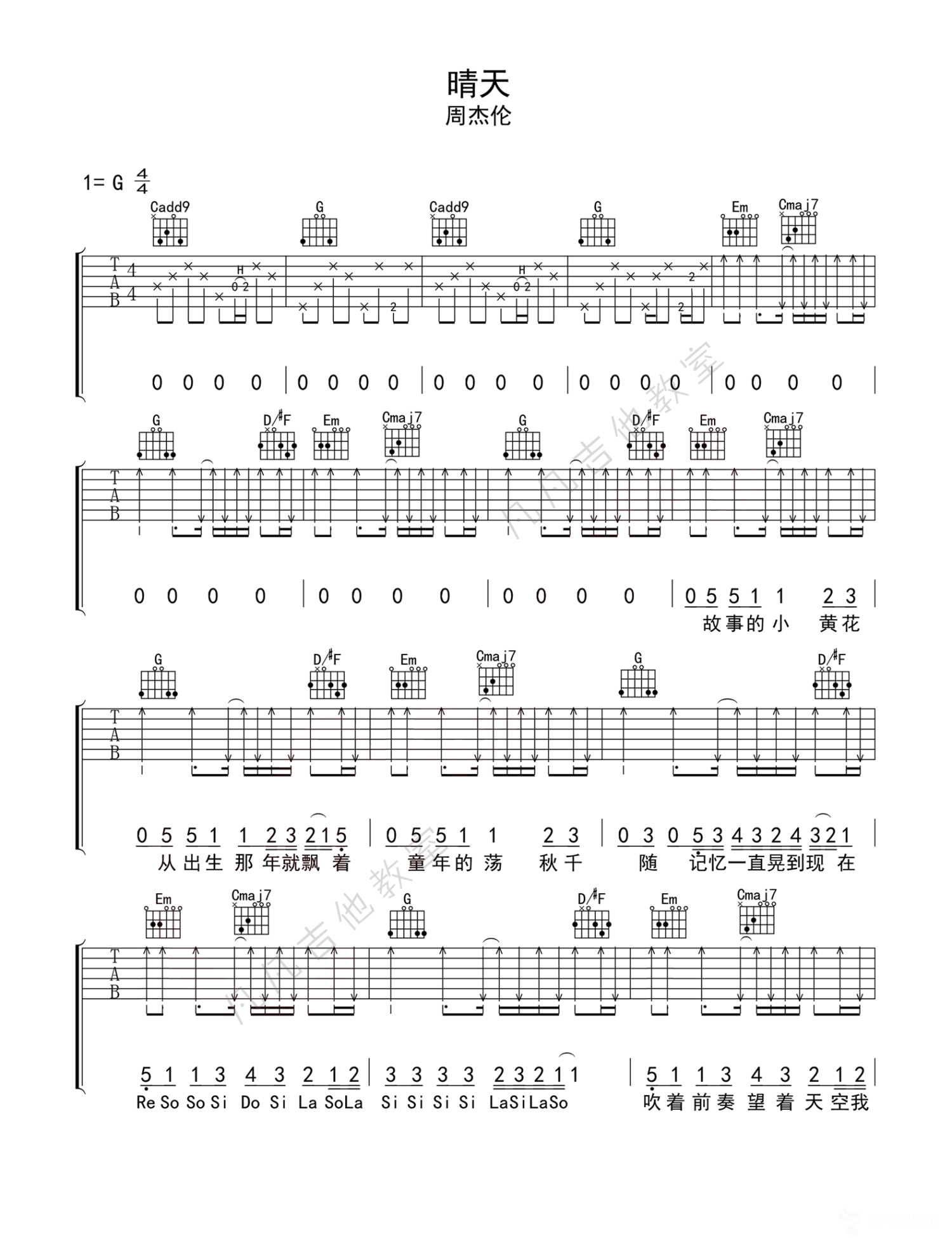 曲谱介绍: 周杰伦《晴天》吉他谱_G调吉他弹唱谱_原版