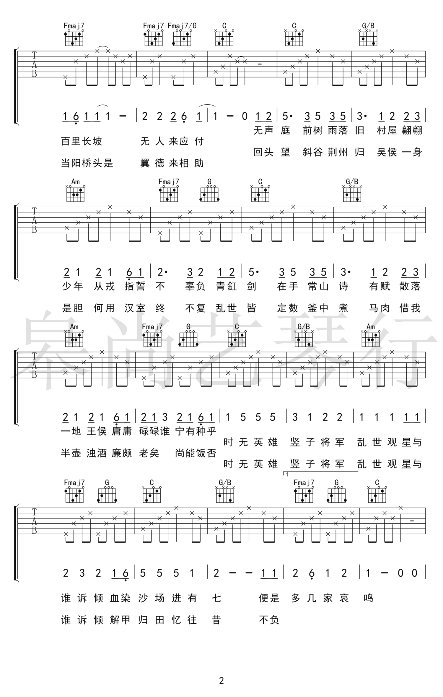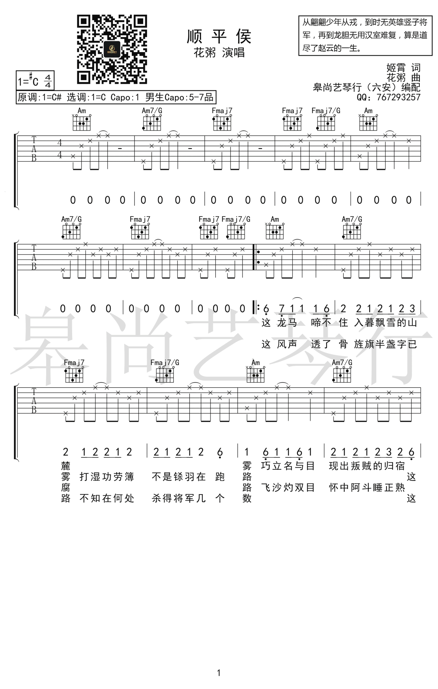 曲谱介绍: 花粥《顺平侯》吉他谱,C调指法弹唱谱,变调夹夹一品,男生建议5-7品。顺平侯六线谱,三张高清图片谱,感谢皋尚艺琴行出品,吉他天下网站上传分享。解甲归田忆往昔,不负人间好光景。花粥作曲姬霄作词的一首新歌。用我三生烟火,换你一世迷离。如果说一万个人心中就有一万个赵子龙,那我就独唱我心中的这一个吧。