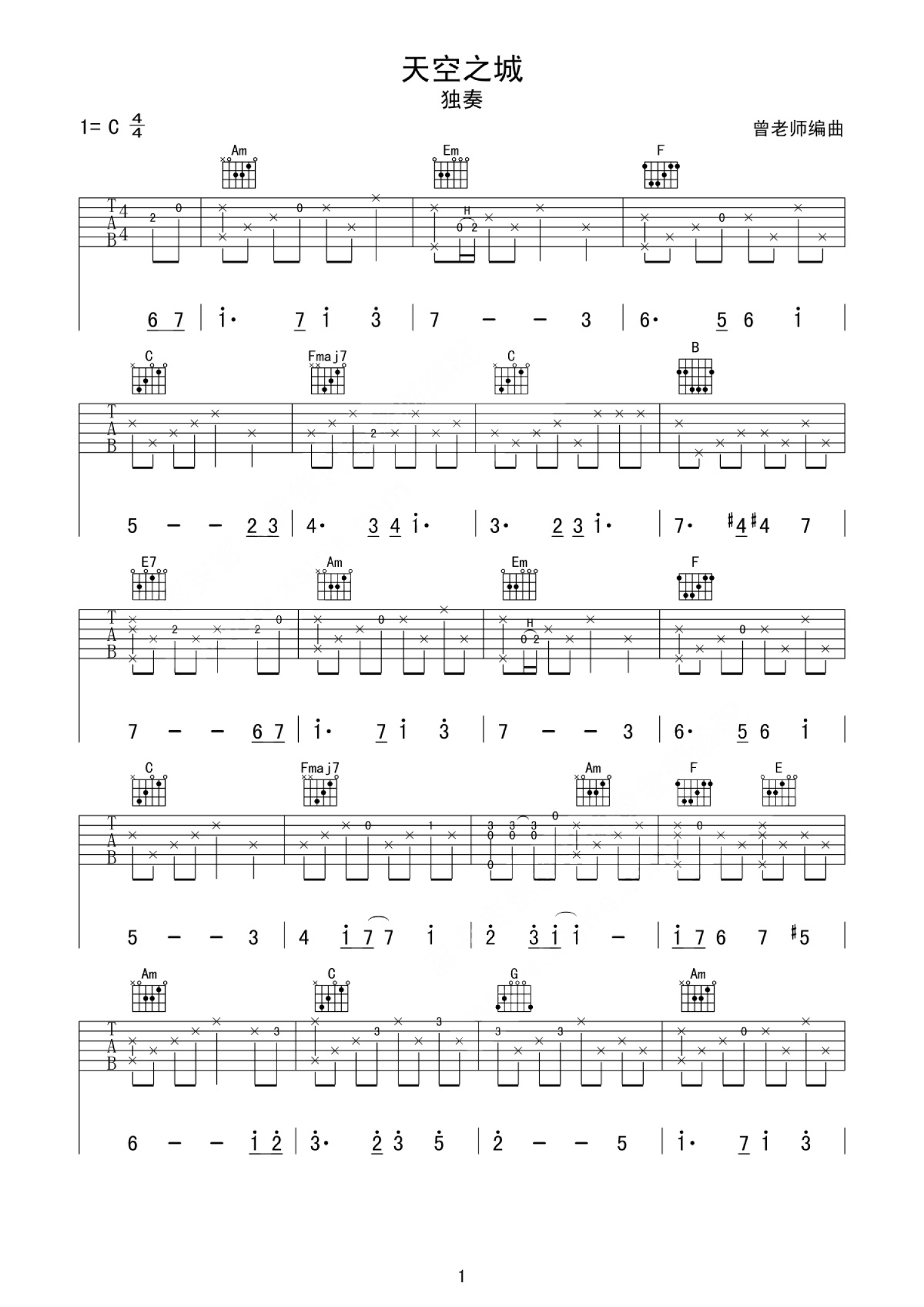 曲谱介绍: 蒋敦豪《天空之城》吉他谱_C调吉他独奏谱