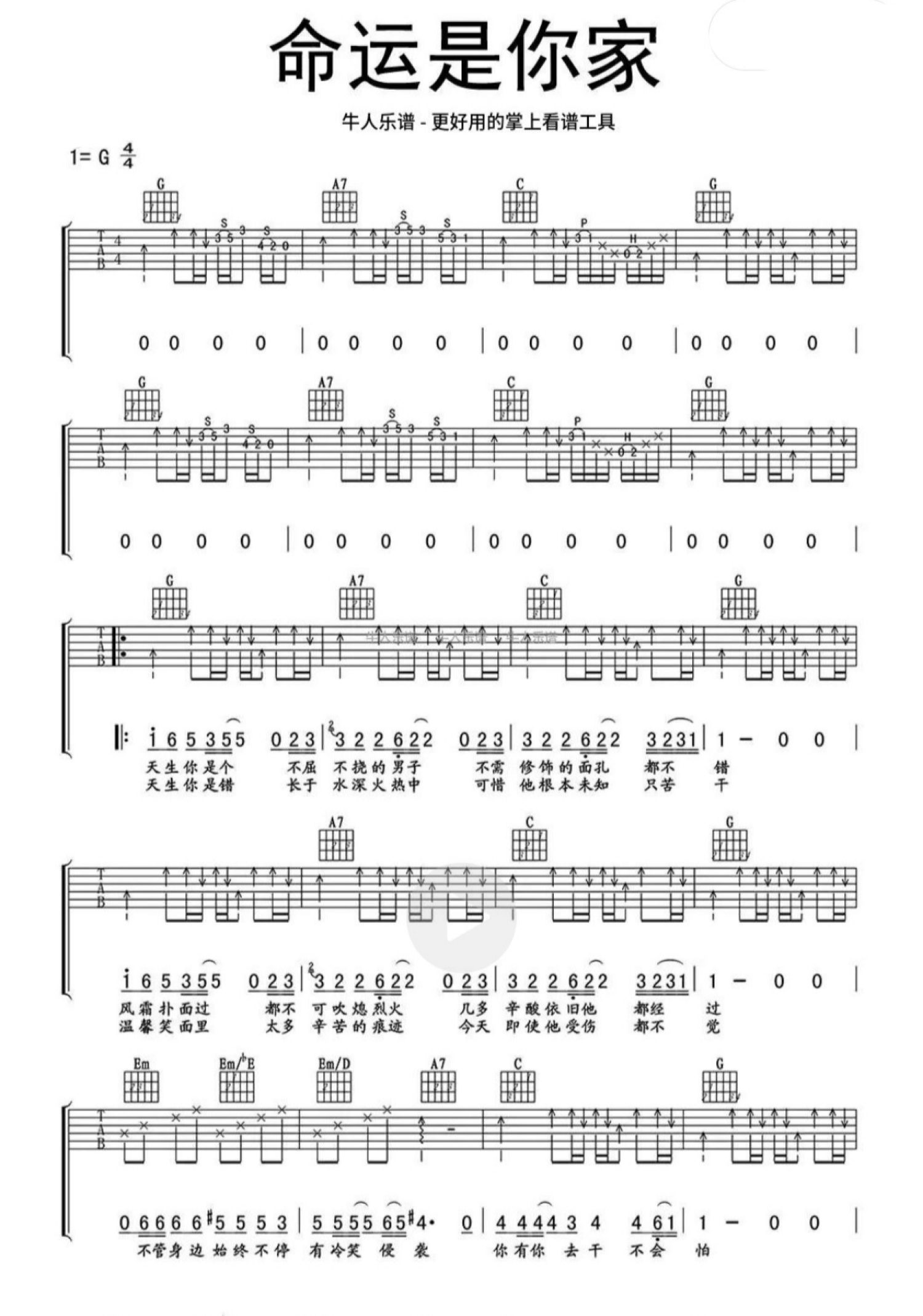 曲谱介绍: beyond《命运是你家》吉他谱_G调吉他弹唱谱