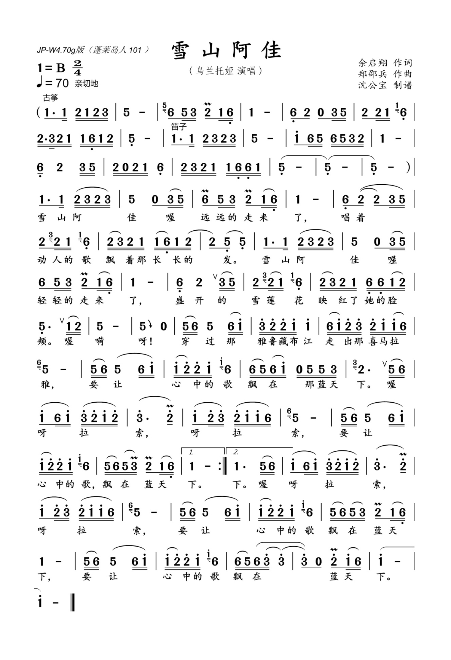 曲谱介绍: 乌兰托娅《雪山阿佳》歌词_简谱