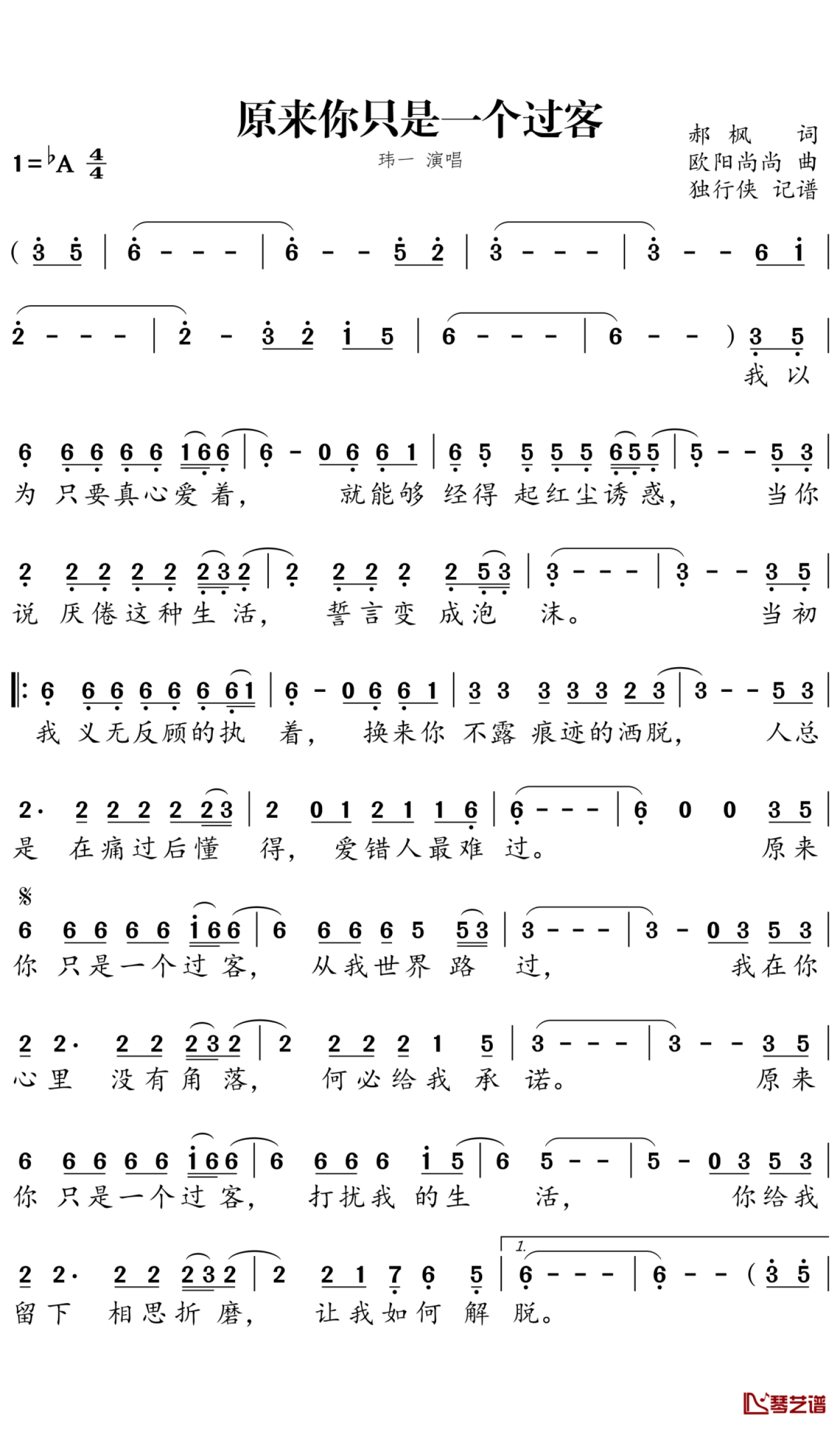 曲谱介绍: 玮一《原来你只是一个过客》歌词_简谱