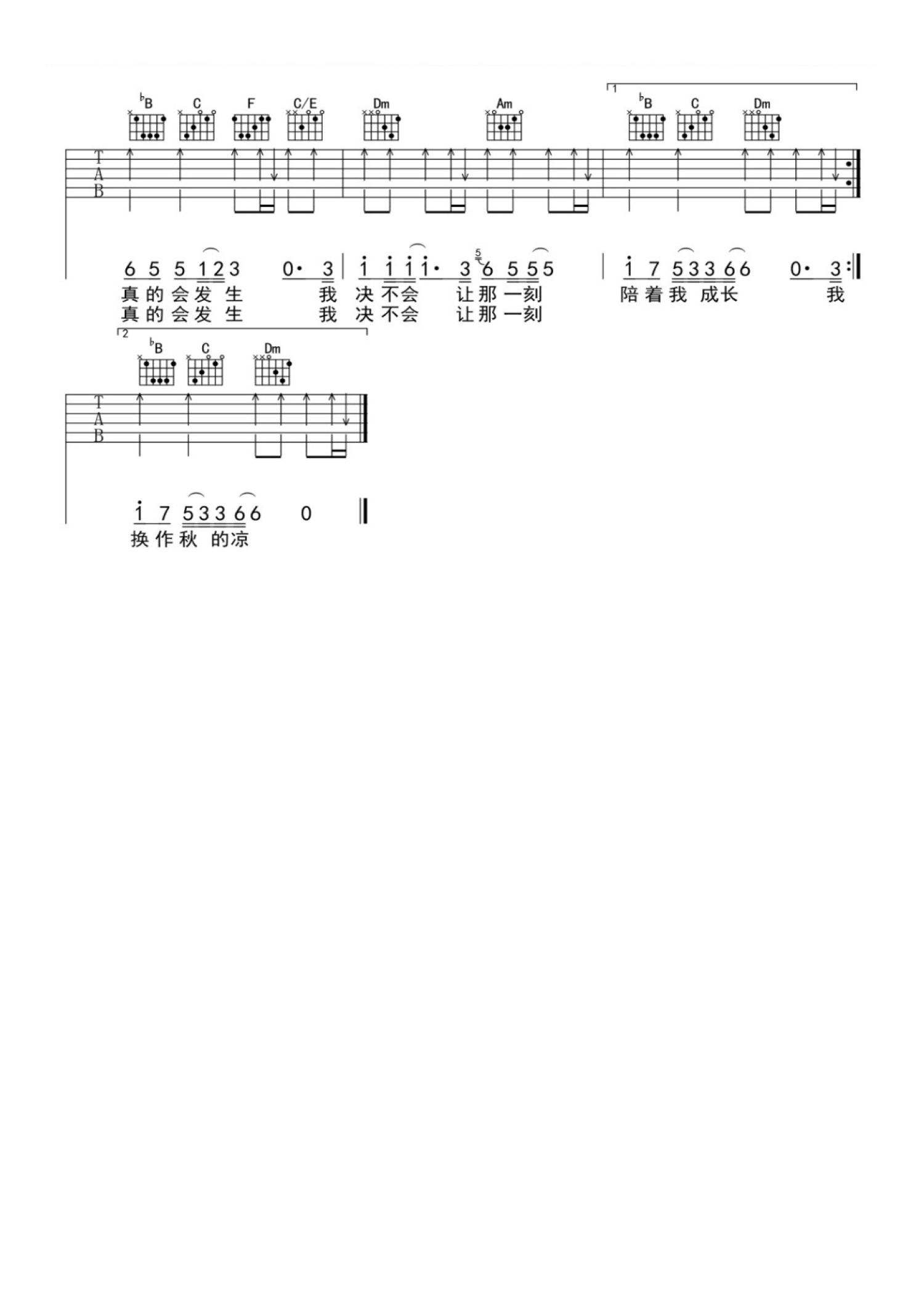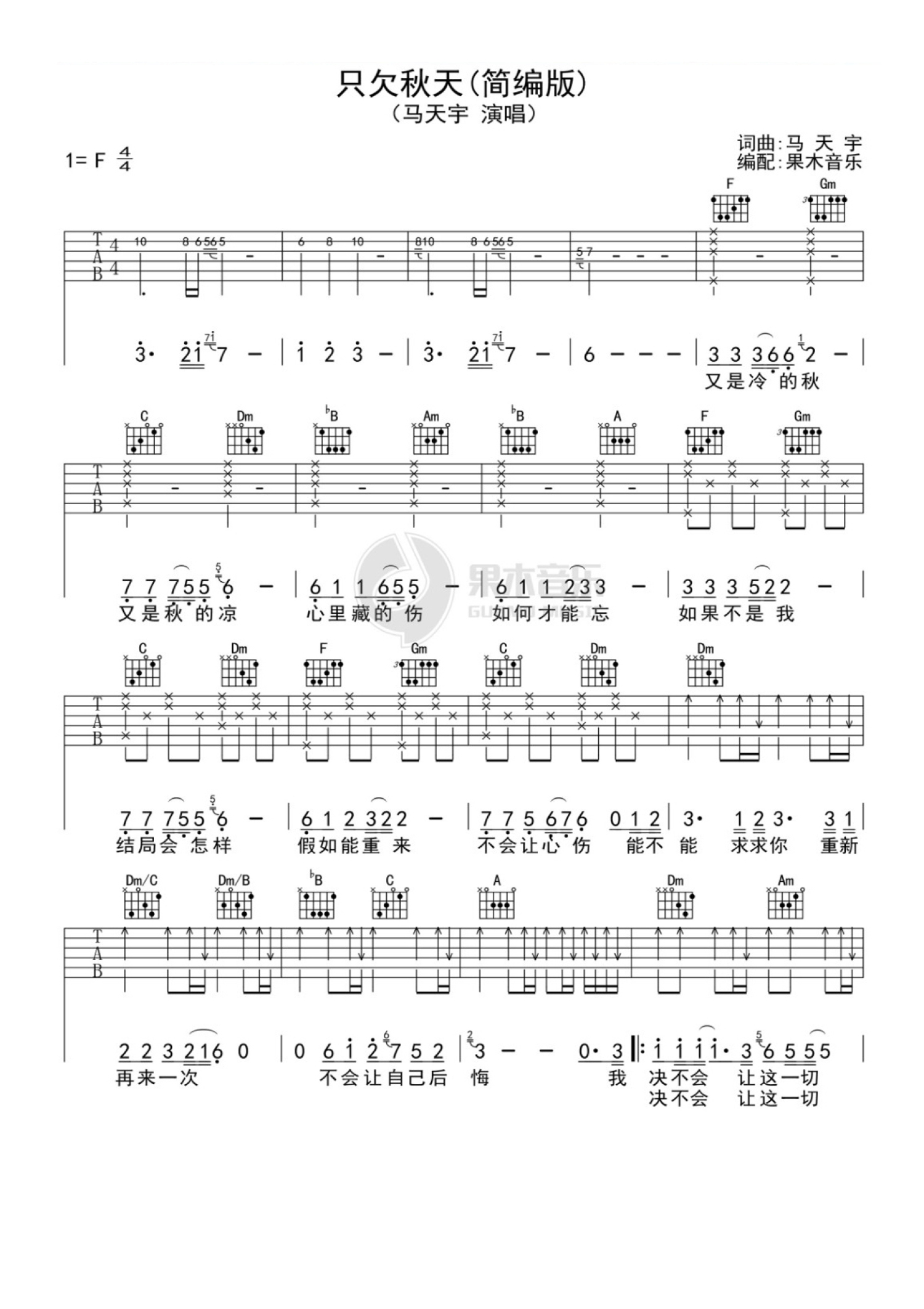 曲谱介绍: 马天宇《只欠秋天》吉他谱_F调吉他弹唱谱_简编版