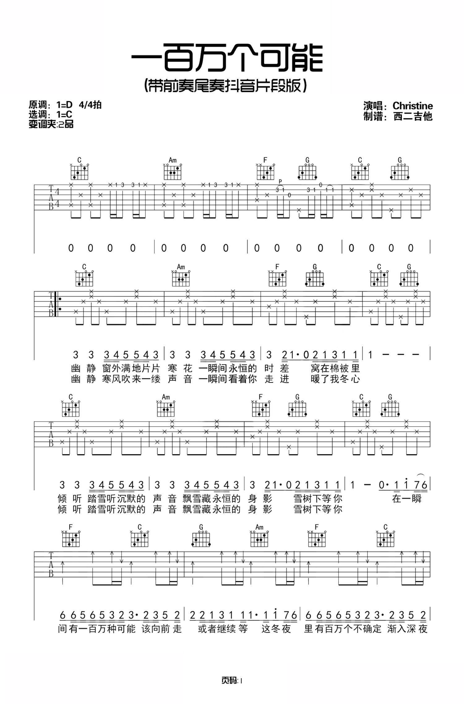 曲谱介绍: 一百万个可能吉他谱,克丽丝叮演唱的一首热门抖音歌曲,一百万个可能六线谱,C调指法弹唱谱,带前奏尾奏抖音片段版本,在我们成长的不同的阶段,每每会面临不一样的选择,当理想遇上现实,当牵手遇上转身,人生的路口总会延伸出不同的方向,不同的选择有不一样的人生,你最后是否成为了自己最想成为的人?