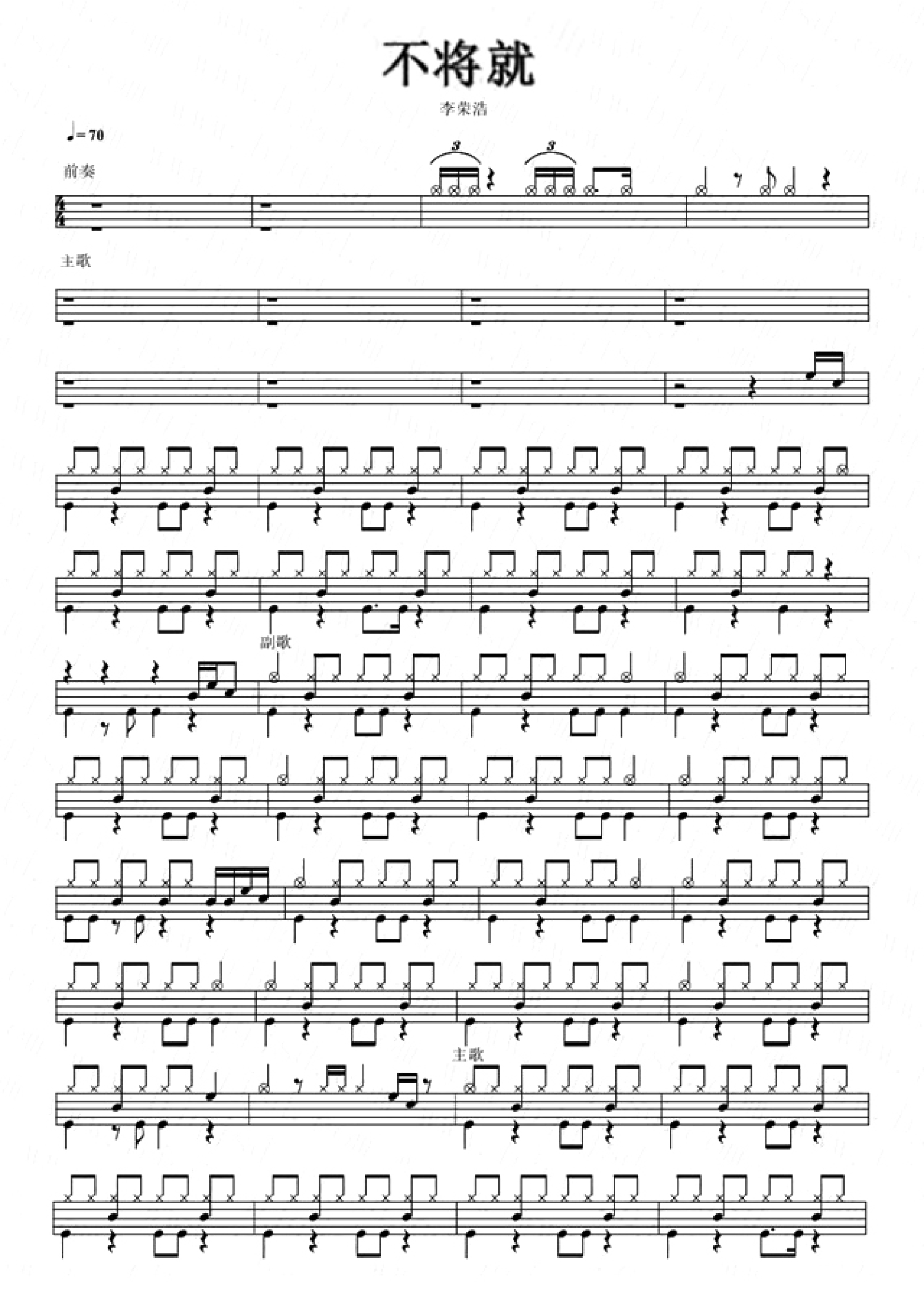 不将就鼓谱 - 李荣浩 - 架子鼓谱
