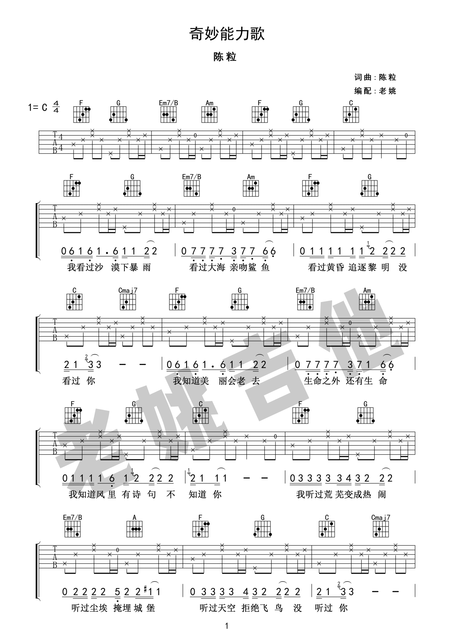 曲谱介绍: 陈粒《奇妙能力歌》吉他谱_C调吉他弹唱谱