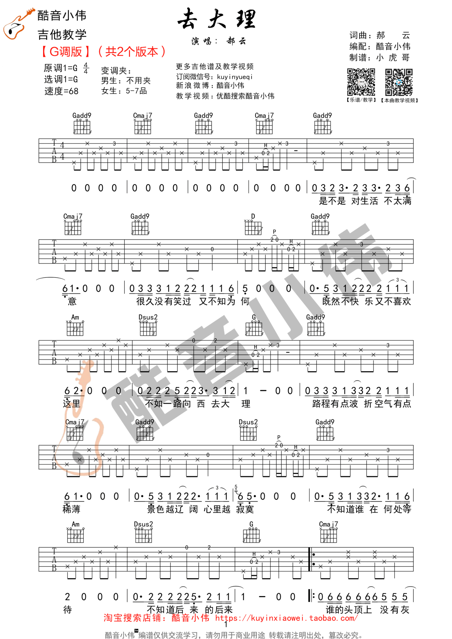 曲谱介绍: 郝云《去大理》吉他谱_G调吉他弹唱谱