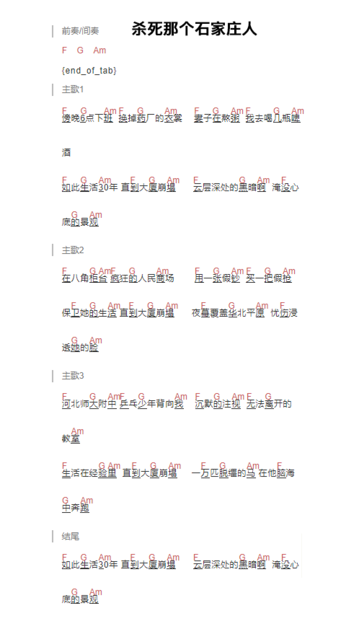曲谱介绍: 万能青年旅店《杀死那个石家庄人》吉他谱_C调吉他弹唱谱_和弦谱