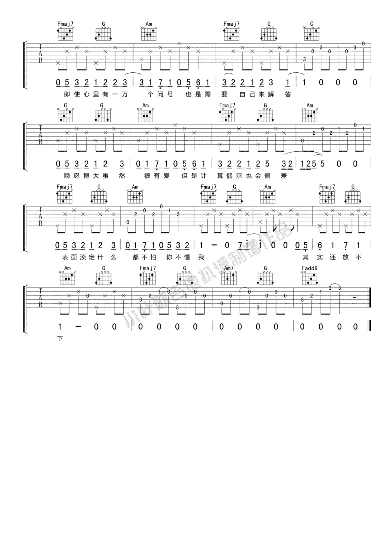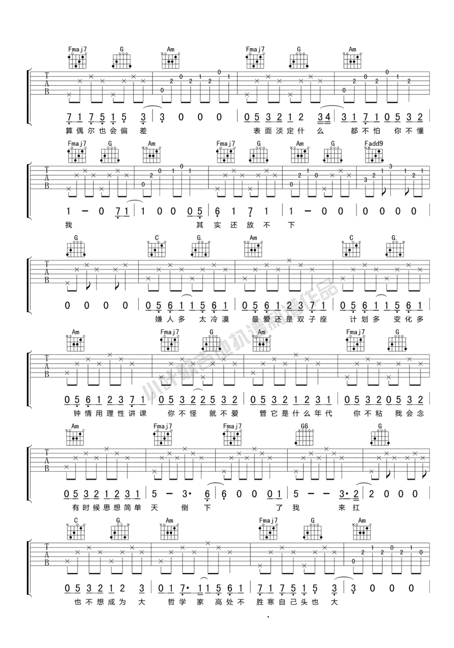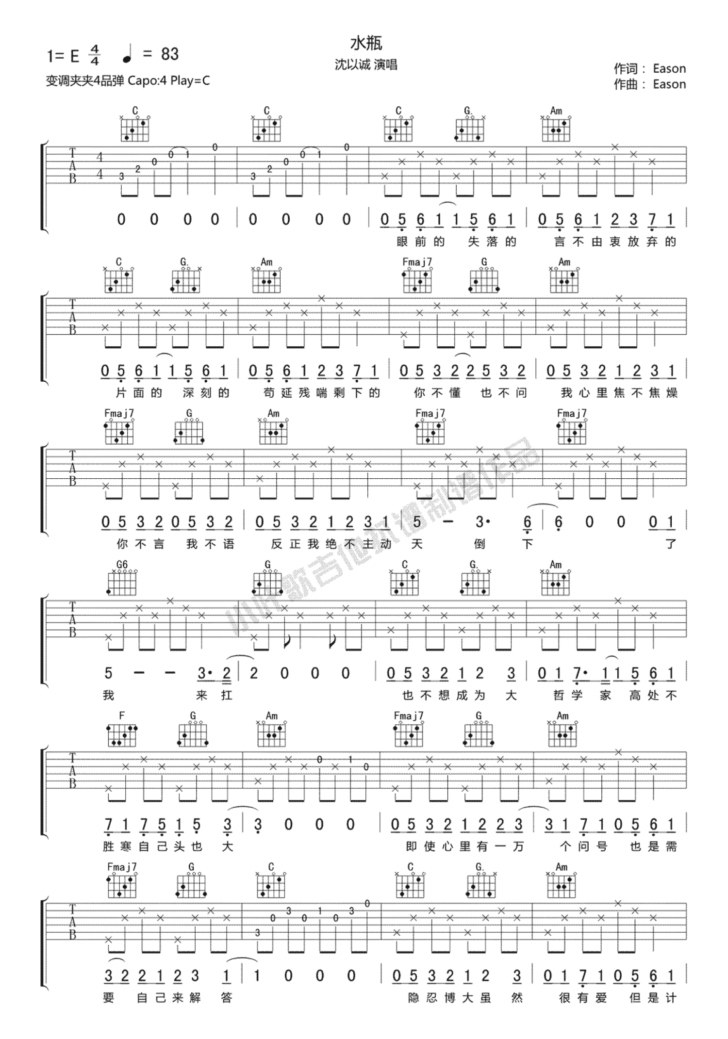 曲谱介绍: 沈以诚《水瓶》吉他谱_C调吉他弹唱谱