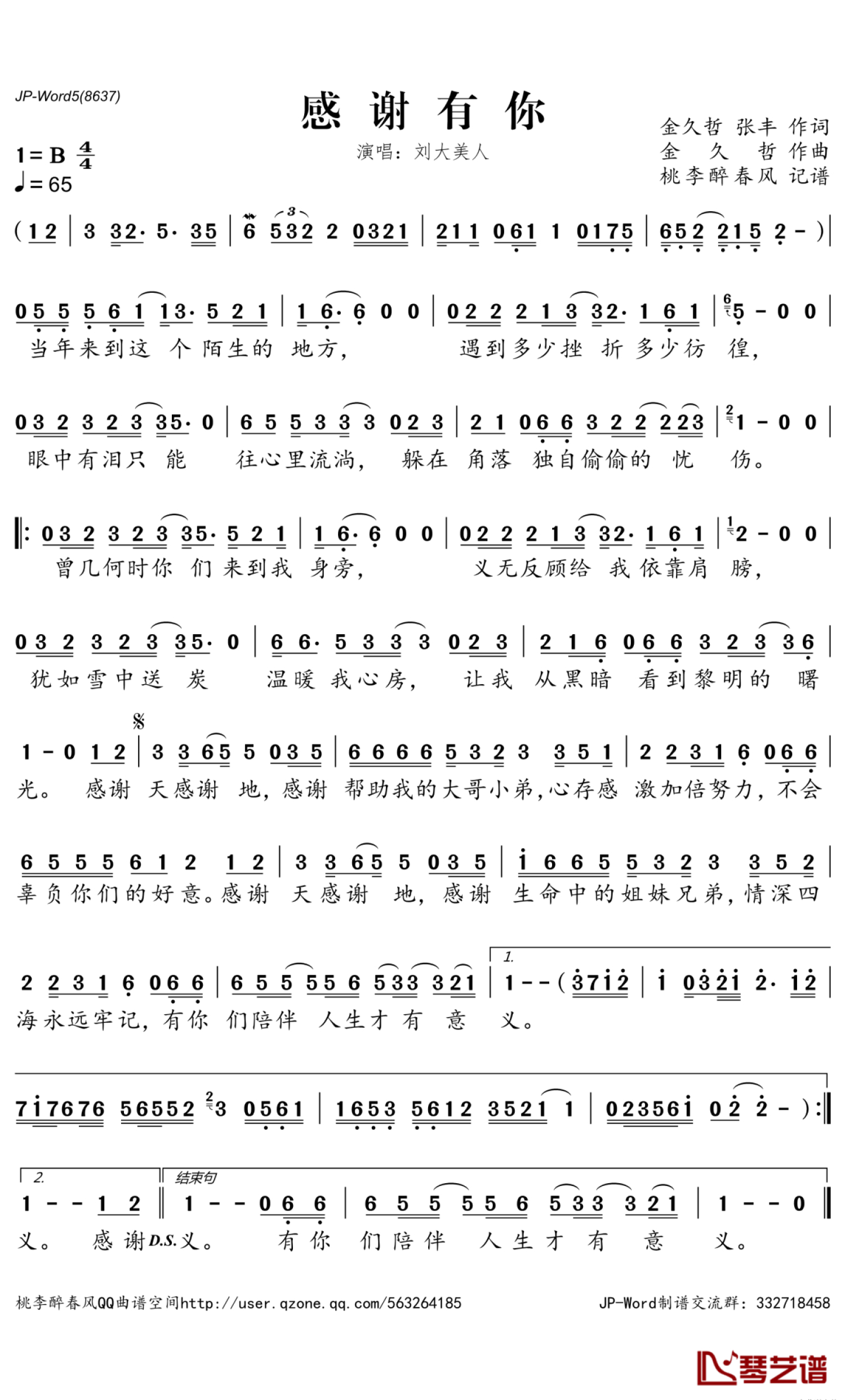 曲谱介绍: 刘大美人《感谢有你》歌词_简谱