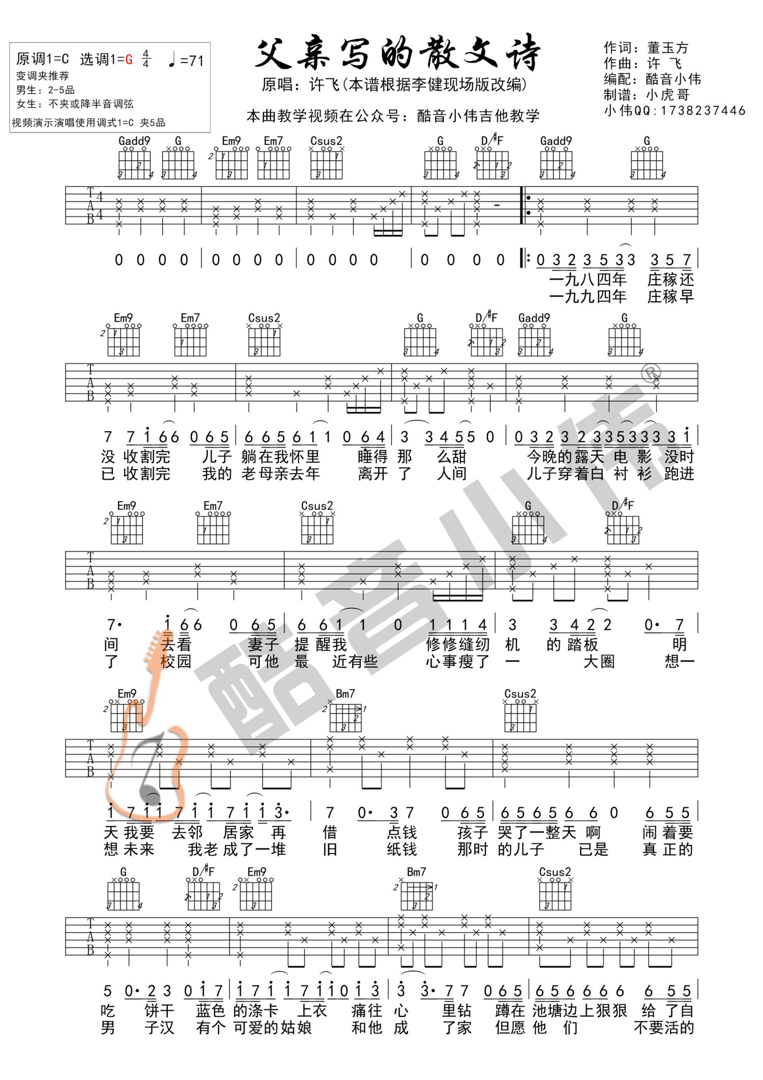 曲谱介绍: 根据李健演唱版本,原调C选调G,变调夹男生2-5品,女生不夹或降半音调弦,视频演示演唱使用调式为C调夹五品。