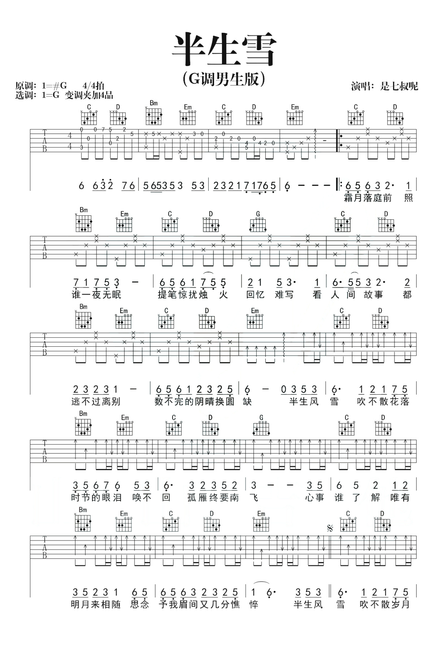 半生雪吉他谱 - 是七叔呢 - G调吉他弹唱谱 - 男生版