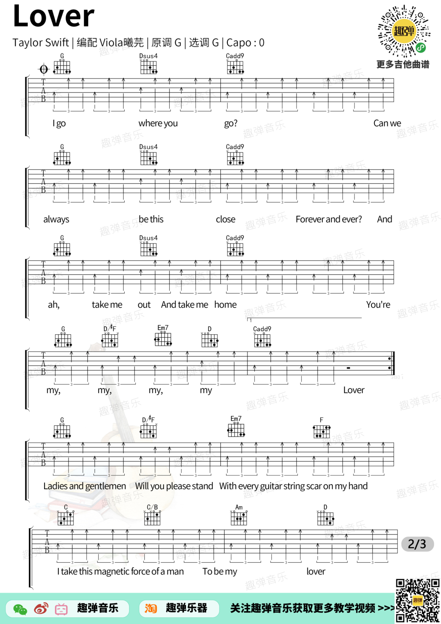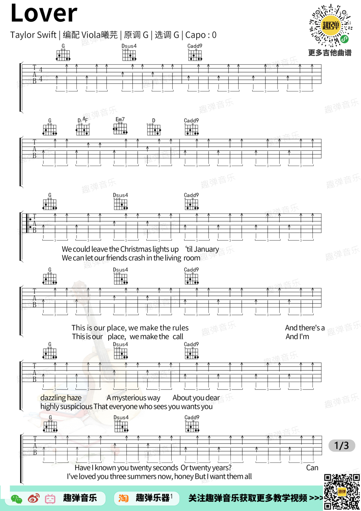 曲谱介绍: TaylorSwift的甜蜜单曲《Lover》,洋洋洒洒的幸福感被Taylor轻盈的表达,轻松让听众沦陷。即使在我们的恋爱中有甜蜜、有争吵、有欢乐、有忧伤,但是我还是想让你知道,你是我的专属情人!《Lover》吉他弹唱视频演示示范《Lover》吉他弹唱教学讲解视频来自趣弹音乐编配《Lover》吉他谱,附弹唱演示和教学讲解。G调原调和弦指法,女生弹唱版,整首歌曲用的扫弦伴奏节奏型,还是比较简单的。