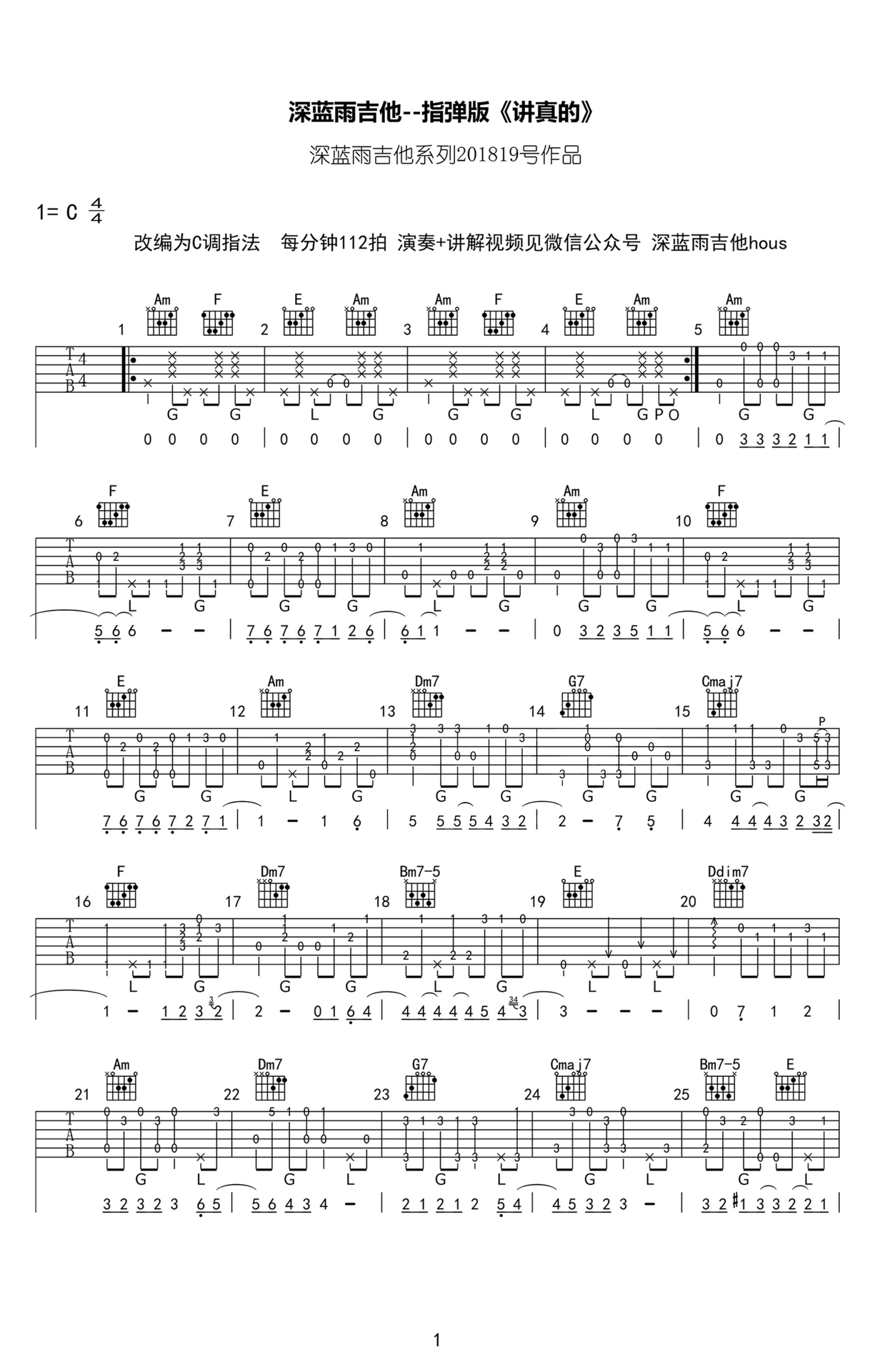 曲谱介绍: 讲真的指弹谱,曾惜的一首热门抖音歌曲改编,摩登兄弟的翻唱演绎也风靡一时。讲真的吉他独奏谱,C调指法,每分钟112拍,随谱附上《讲真的》指弹吉他教学视频。吉他指弹视频讲解教学