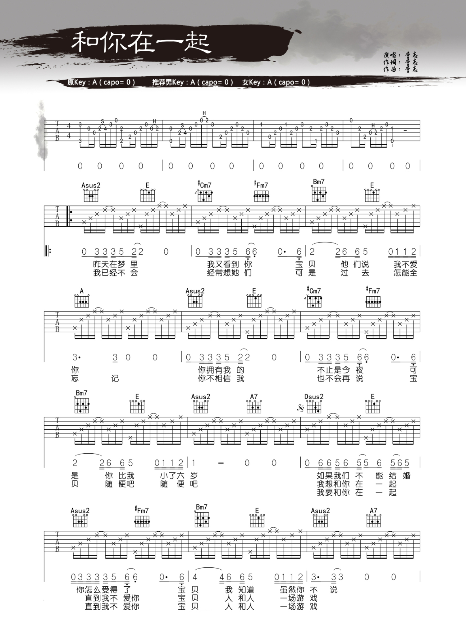 曲谱介绍: 李志《和你在一起》吉他谱_A调吉他弹唱谱