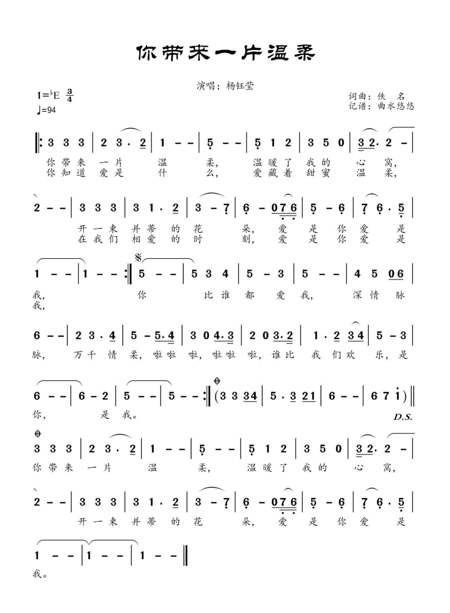 曲谱介绍: 杨钰莹《你带来一片温柔》歌词_简谱
