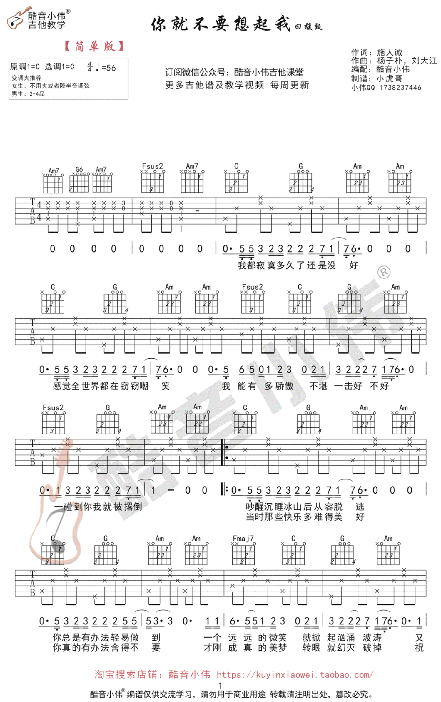曲谱介绍: 田馥甄《你就不要想起我》吉他谱_C调吉他弹唱谱_简单版