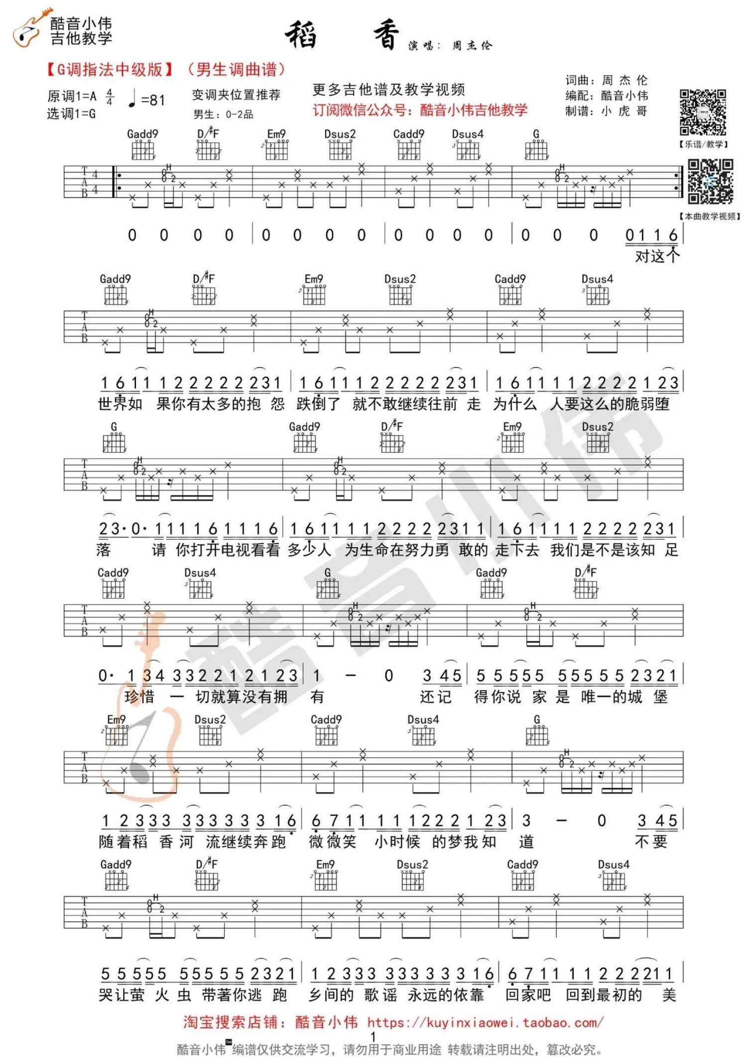 曲谱介绍: 周杰伦《稻香》吉他谱_G调吉他弹唱谱_中级版
