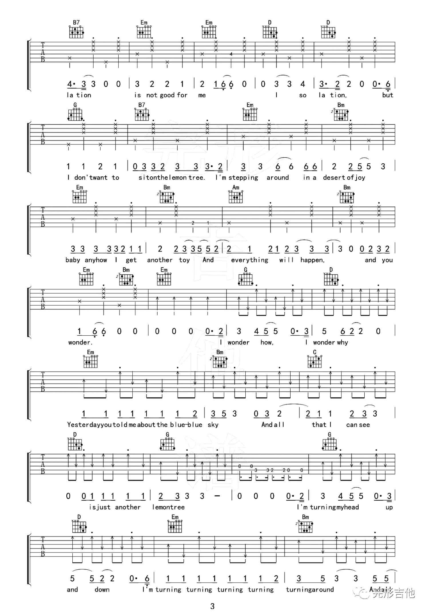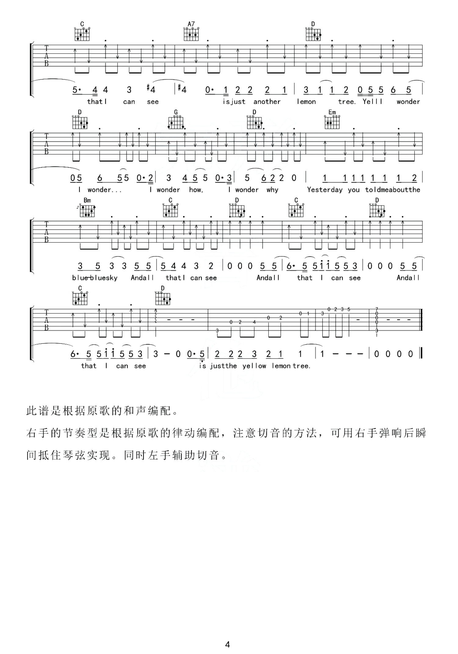 曲谱介绍: 《柠檬树》吉他谱分享,来自完形吉他编配高清图片六线谱,变调夹夹第一品用G调指法演奏。这首歌听起来旋律欢快,可实际上歌词却给人一种淡淡的忧伤,刚好也揭示着恋爱总是苦涩与愉悦相伴,这悲伤的情愫和欢快的旋律结合在一起,反而让人觉得格外迷人。 本曲谱是根据歌曲原版和声编配,右手的节奏型是根据原歌的律动编配,注意切音的方法,可用右手弹响后瞬间抵住琴弦实现,同时左手辅助切音。