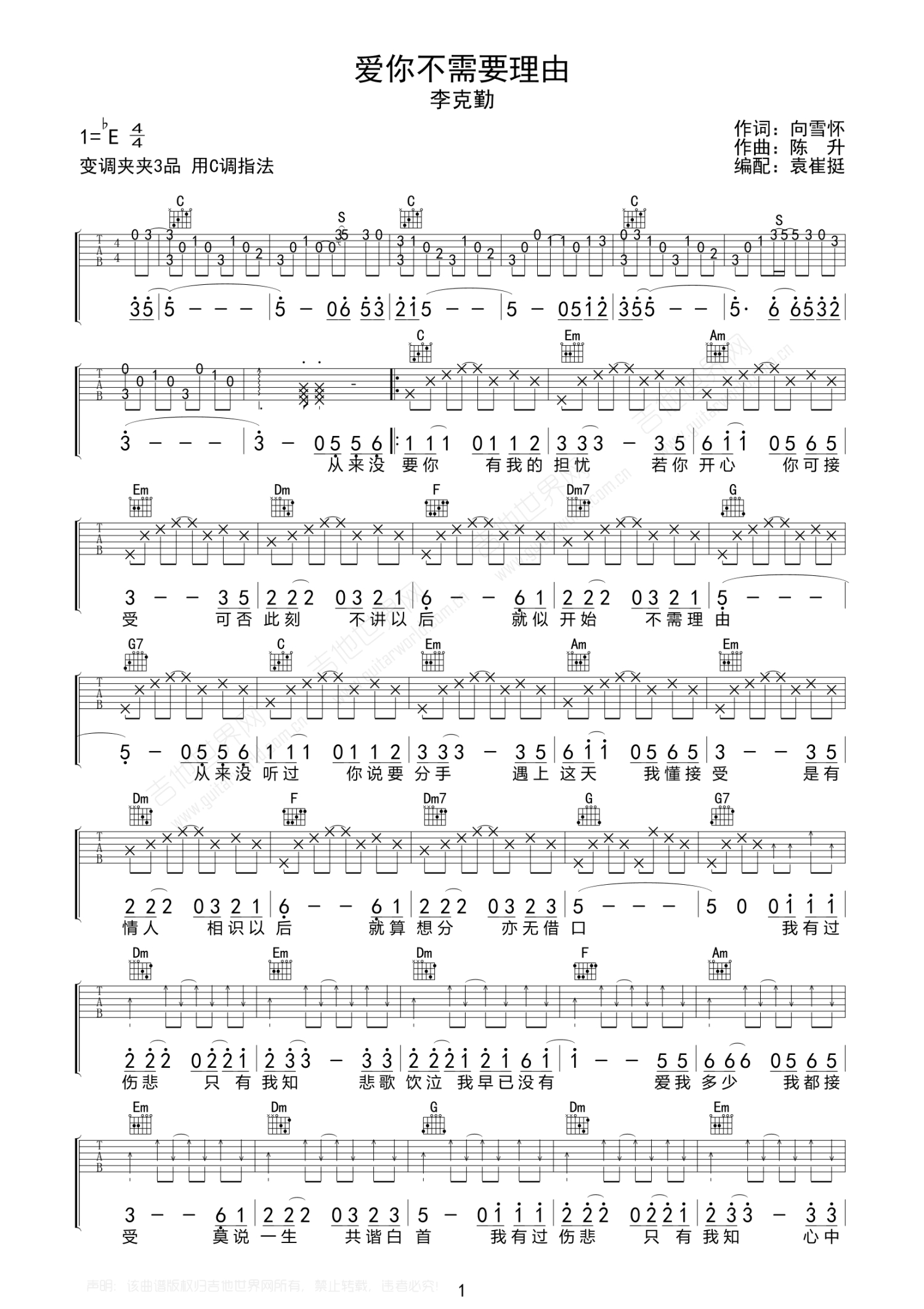 曲谱介绍: 李克勤《爱你不需要理由》吉他谱_C调吉他弹唱谱