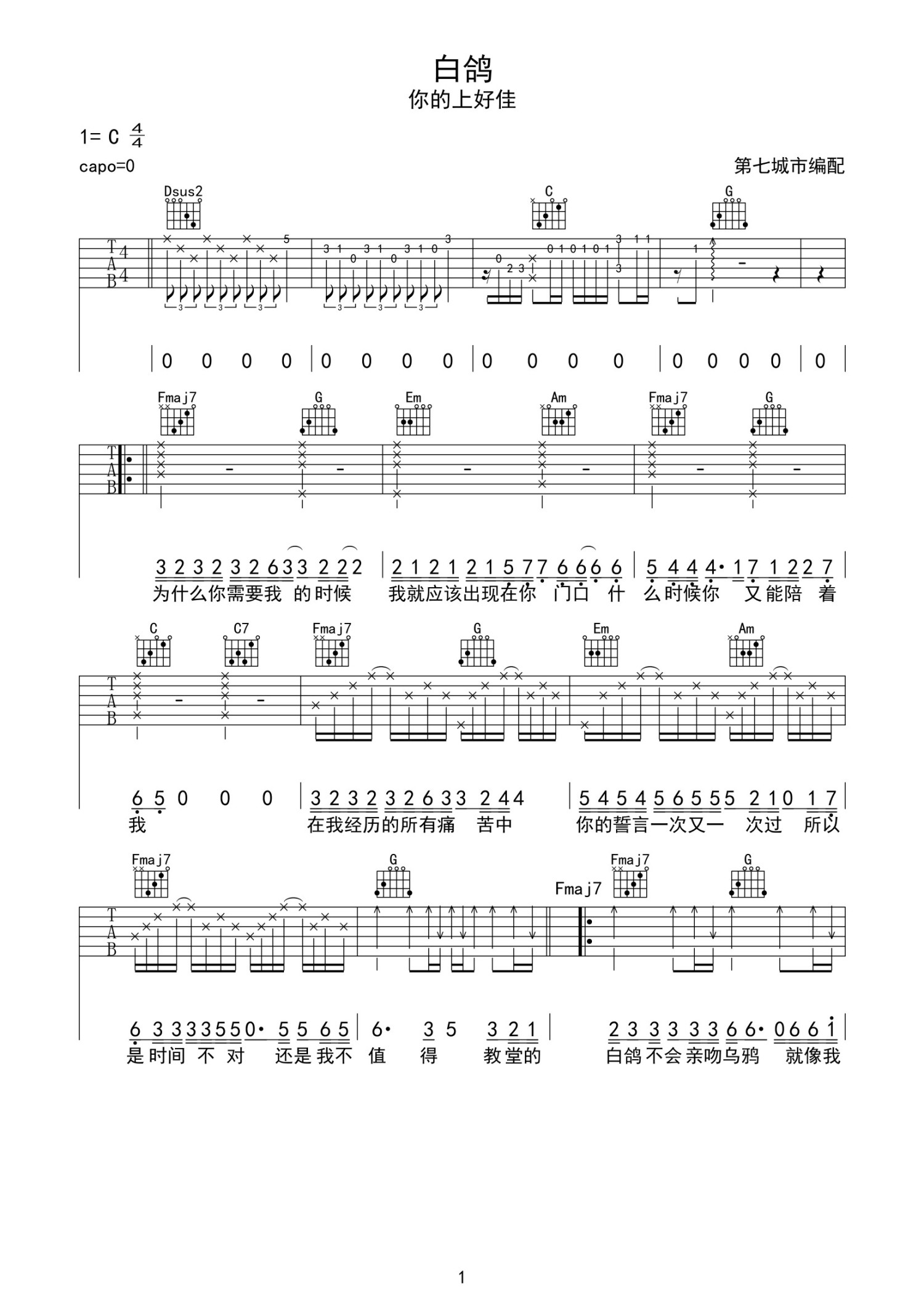 曲谱介绍: 你的上好佳《白鸽》吉他谱_C调吉他弹唱谱