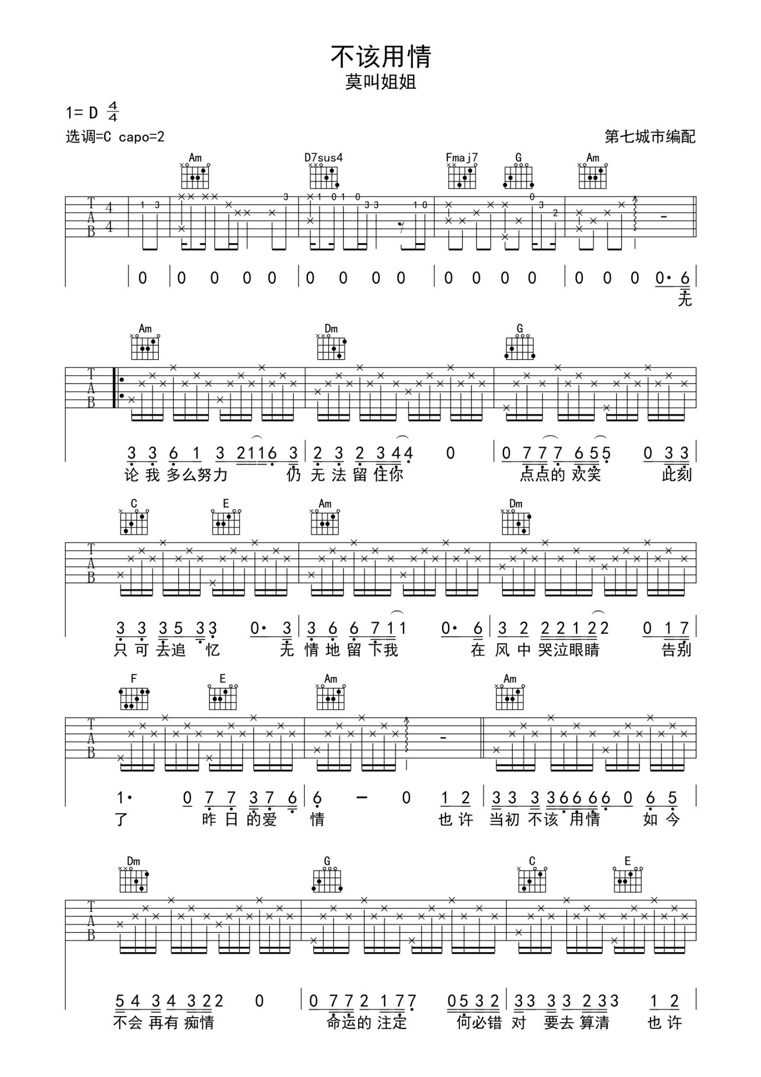曲谱介绍: 莫叫姐姐《不该用情》吉他谱_C调吉他弹唱谱
