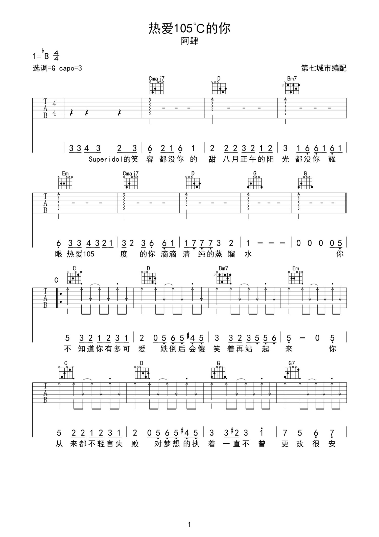 • 热爱105度的你吉他谱 - 阿肆 - G调吉他弹唱谱第1张