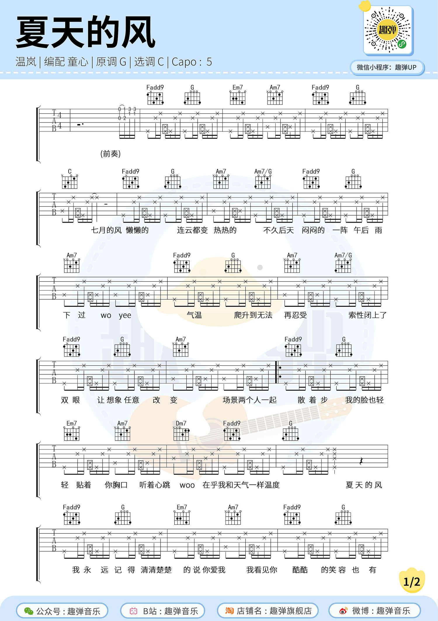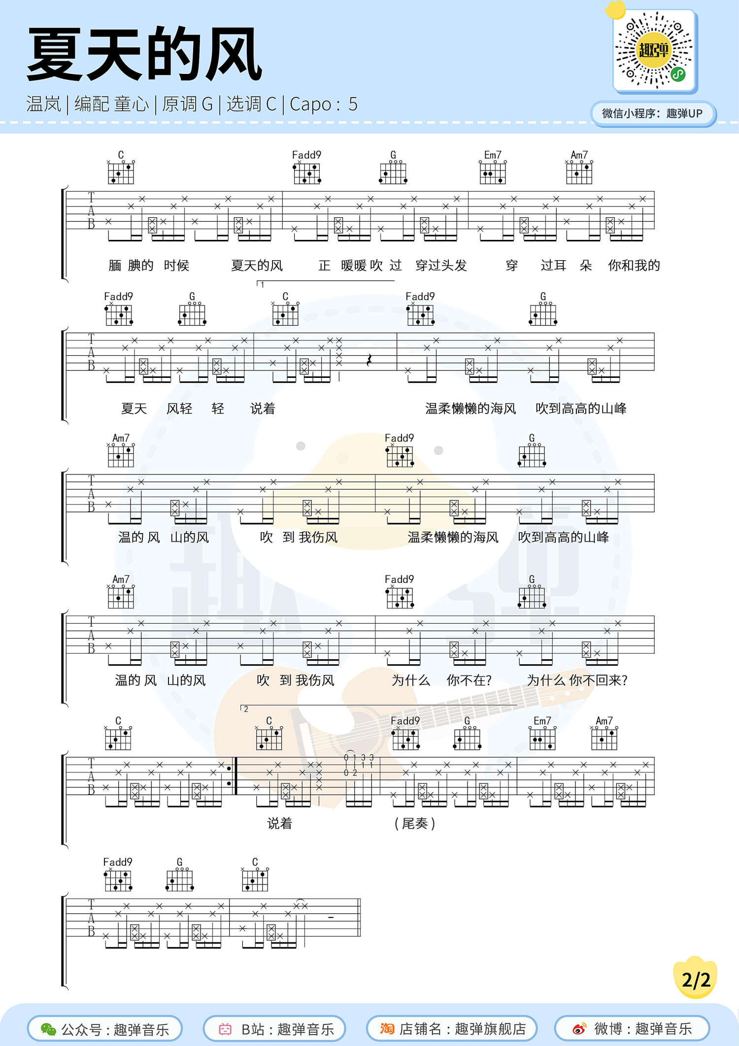曲谱介绍: 温岚《夏天的风》吉他谱_C调吉他弹唱谱