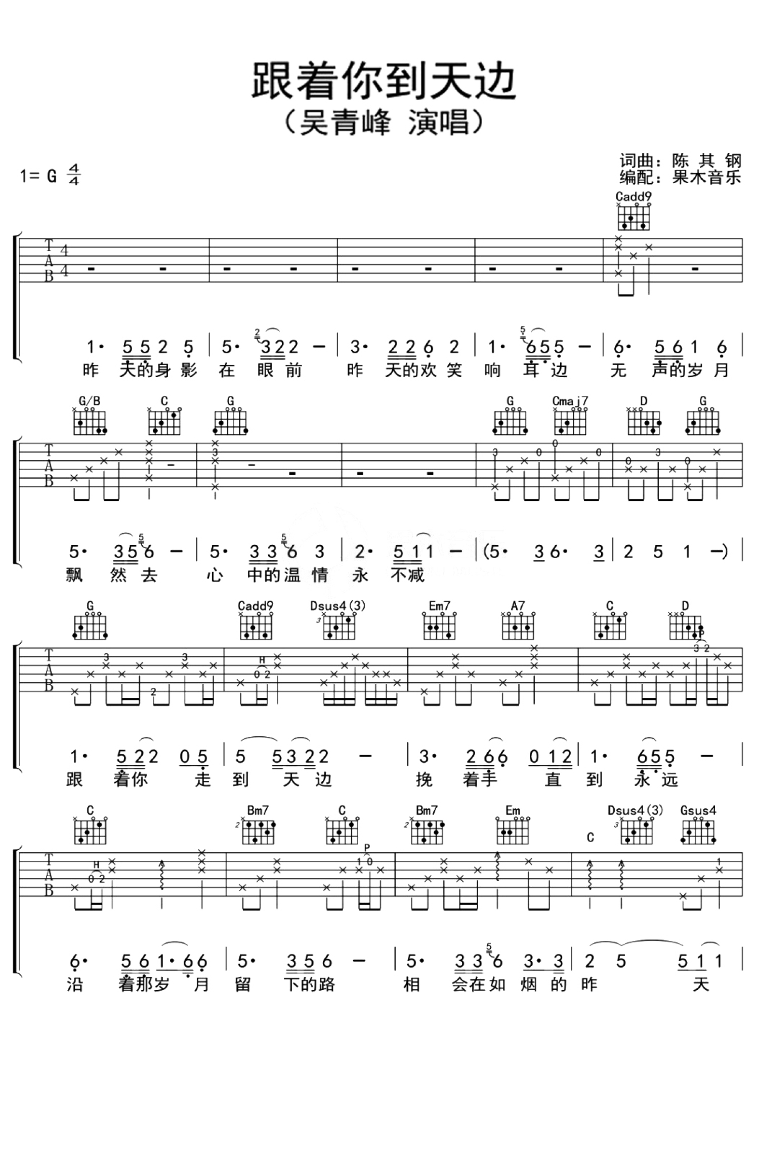 曲谱介绍: 吴青峰《跟着你到天边》吉他谱_G调吉他弹唱谱