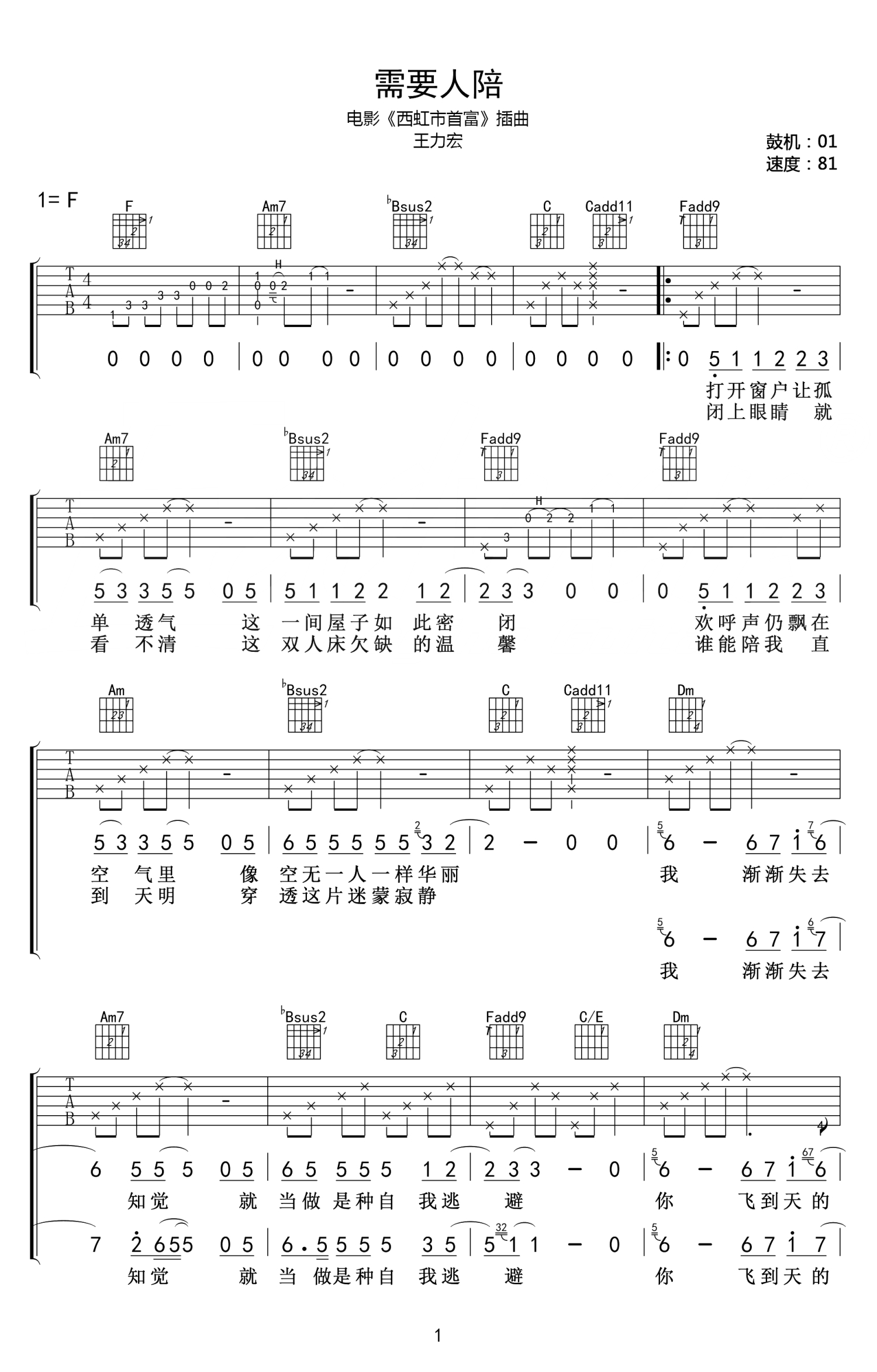 需要人陪吉他谱 - 王力宏 - 吉他弹唱谱