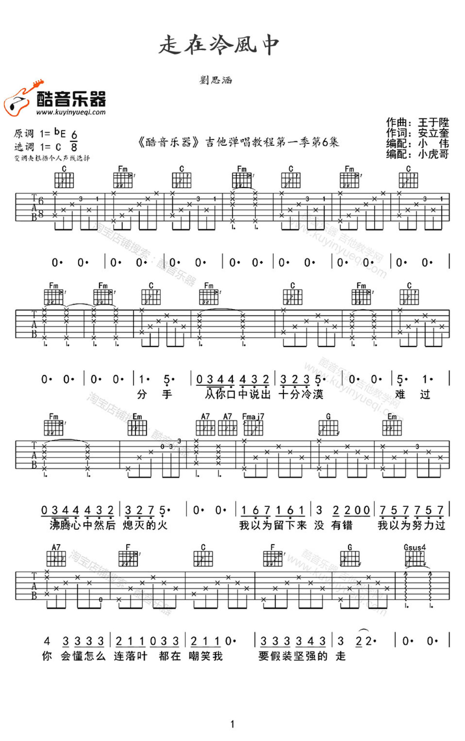 曲谱介绍: 刘思涵《走在冷风中》吉他谱_C调吉他弹唱谱