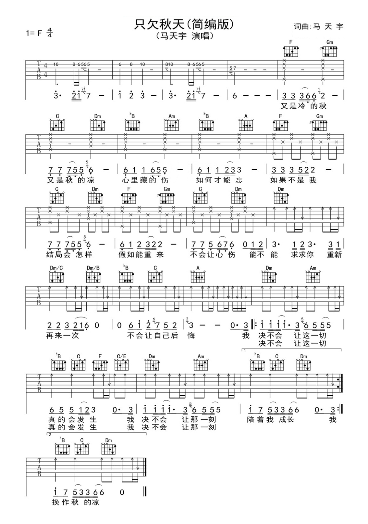 曲谱介绍: 马天宇《只欠秋天》吉他谱_F调吉他弹唱谱_单页版