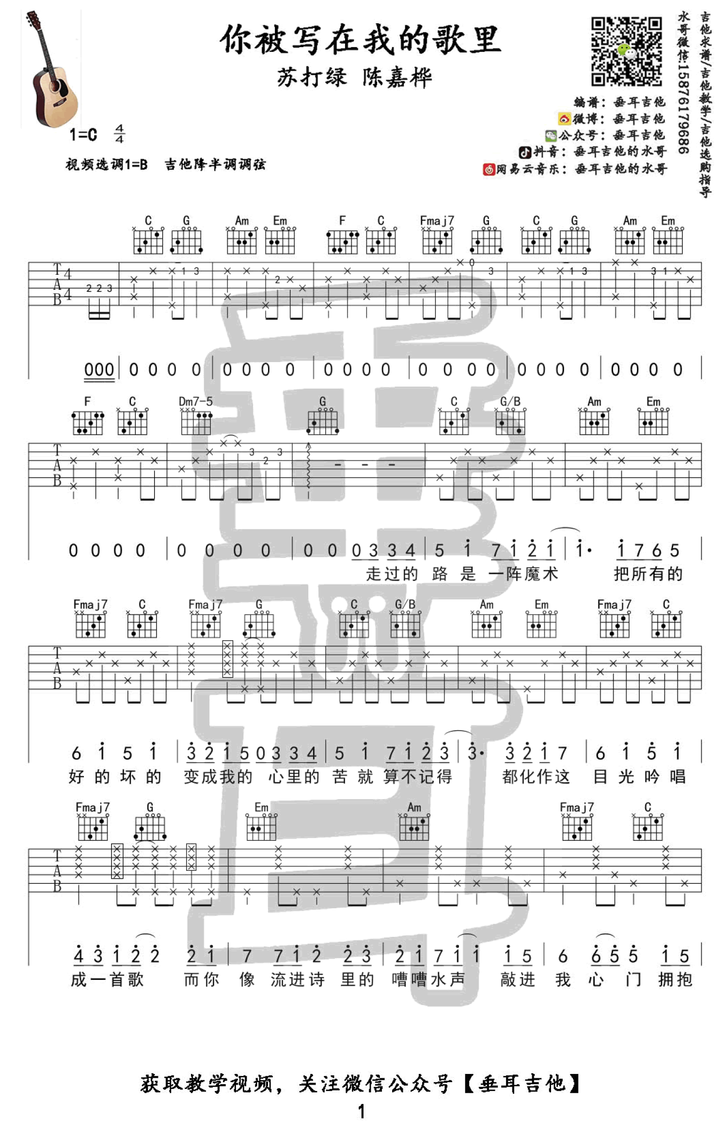 曲谱介绍: 苏打绿《你被写在我的歌里》吉他谱,C调弹唱谱,视频选调B,吉他降半音调弦,苏打绿和陈嘉桦合唱的一首歌曲,你被写在我的歌里六线谱,温柔的声线,让人想起学生时代的美好,宝贵到无法形容的过去的点滴。老师的示范讲解练习。吉他弹唱教学视频
