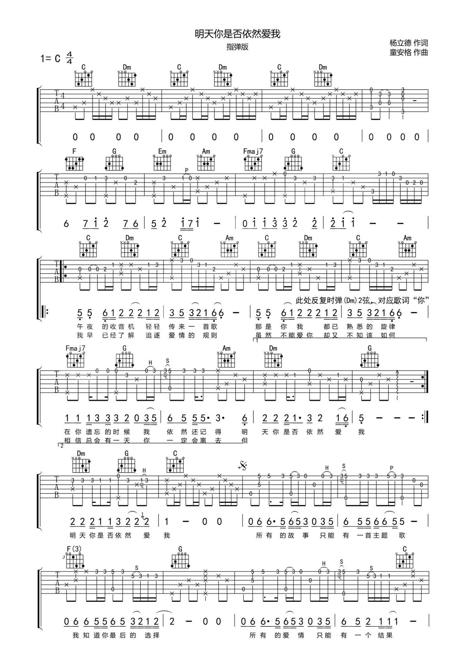 • 明天你是否依然爱我吉他谱 - 童安格 - C调吉他独奏谱第1张