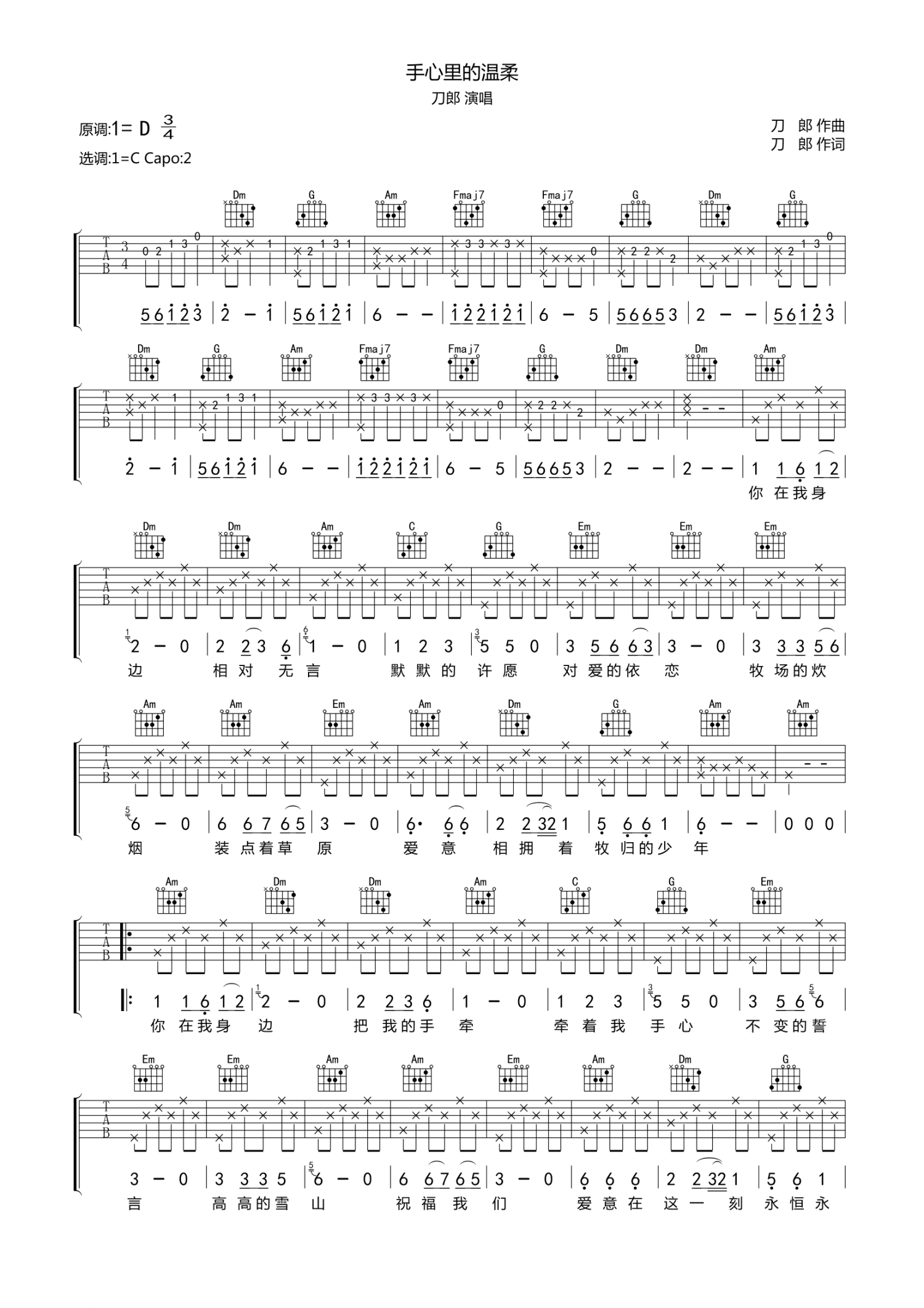 曲谱介绍: 刀郎《手里的温柔》吉他谱_C调吉他弹唱谱