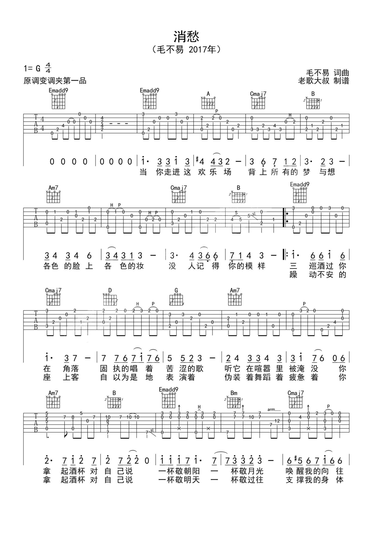 曲谱介绍: 毛不易《消愁》吉他谱_G调吉他独奏谱